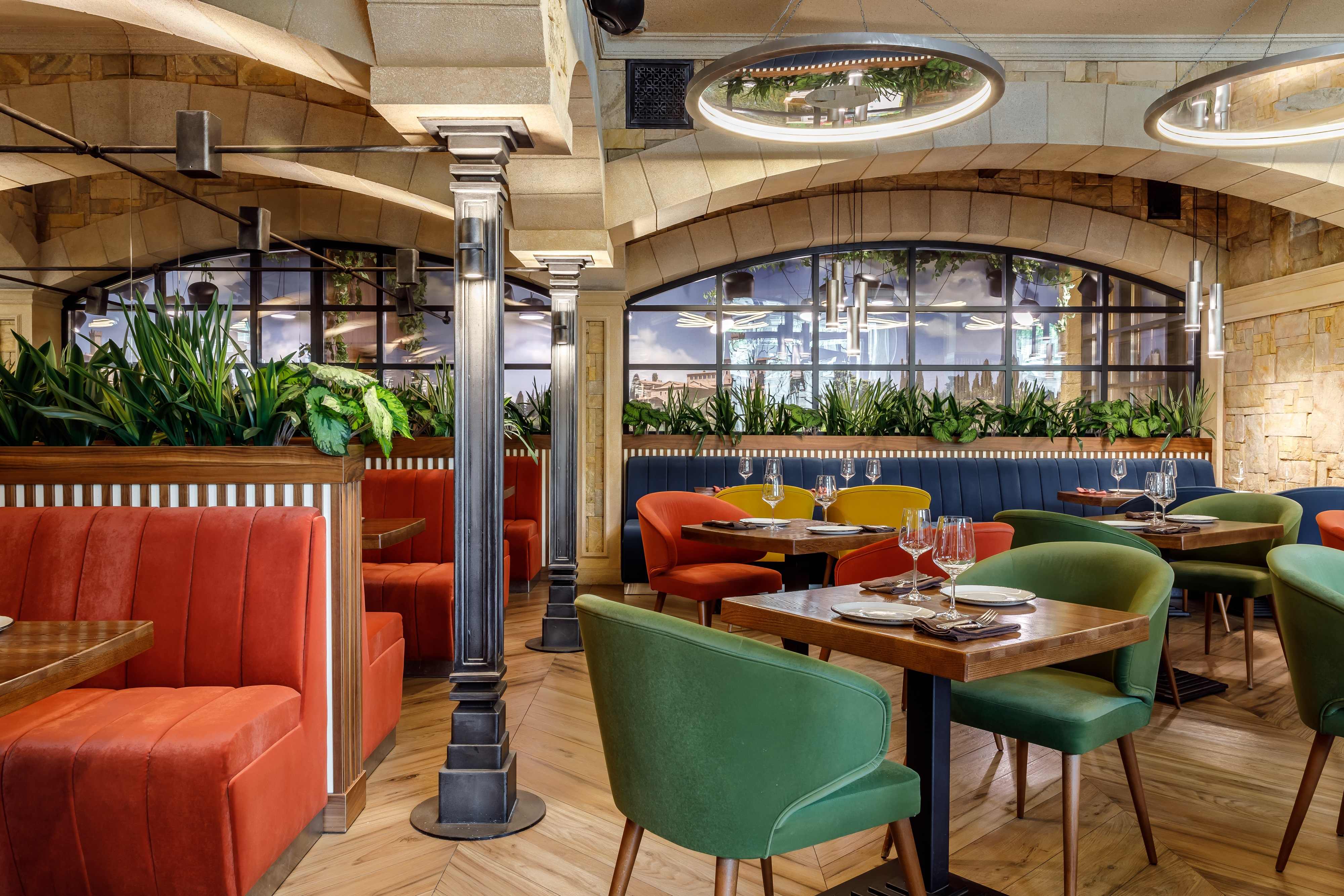 О проекте: Patio Corleone - ресторан, который размещается в многоэтажном доме в цокольной его части. Главная задача проекта - создать впечатление, будто при строительстве в основании многоэтажного дома были найдены различные старинные артефакты, связанные с древними раскопками Рима или Помпей. Сделан акцент на натуральных материалах - камень песчаник поддерживают изящные литые монолитные чугунные колонны. Интересны решения, связанные с деревянными конструкциями бара, керамогранит, имитирующий натуральный мрамор. Вся игра связана с тематикой природных материалов и кухни из натуральных продуктов - это сыр, вино, мясо, хлеб. Полный света ресторан удобен как для проведения шумных семейных праздников, так и для спокойных ужинов. Большая детская комната с педагогом увлечет самых маленьких гостей.
