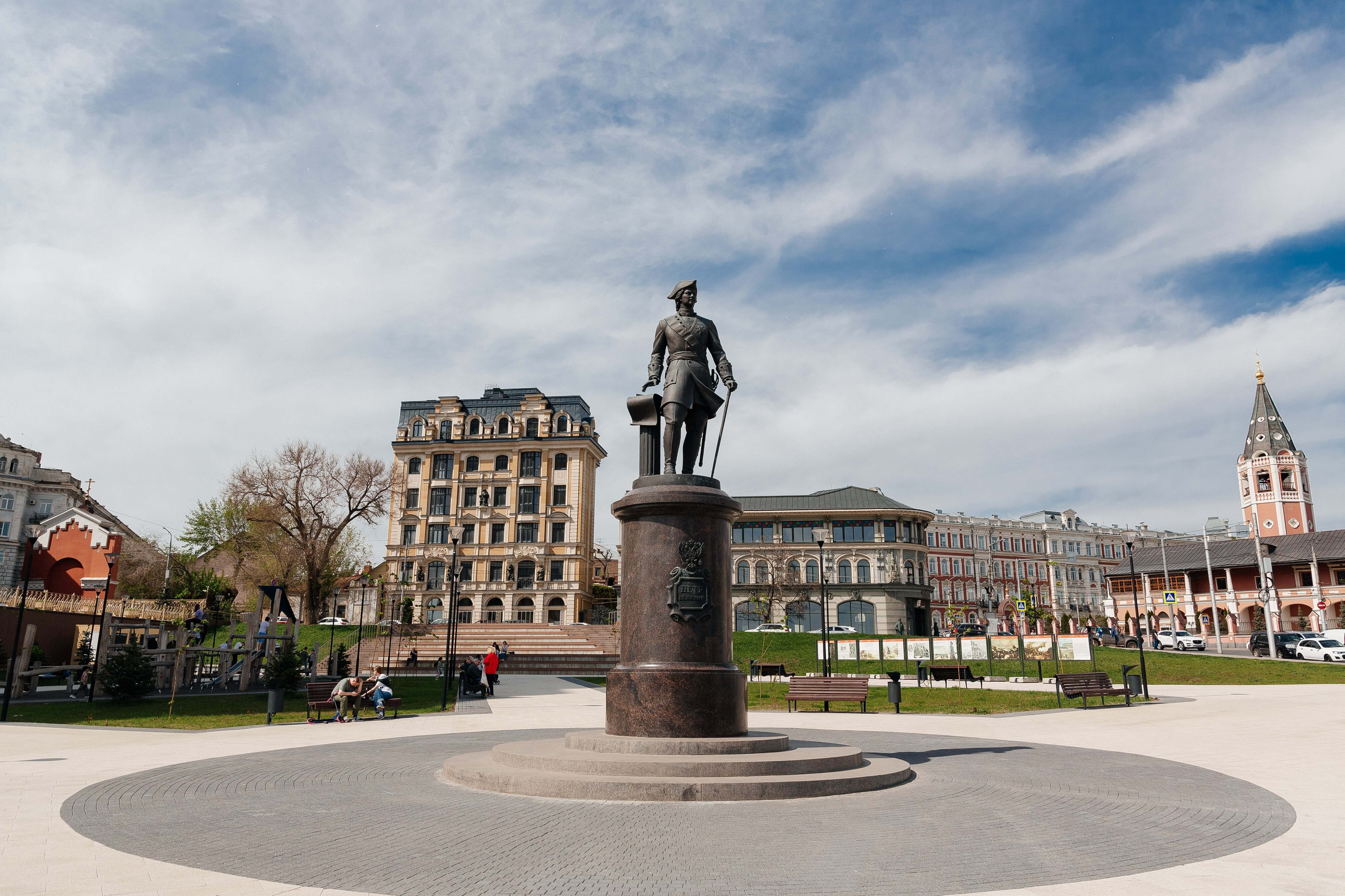 О проекте: Памятник Петру Первому установлен на одноименной площади перед зданием Речного вокзала в честь 350-летия со дня рождения великого императора и 300-летия с момента его визита в Саратов.
