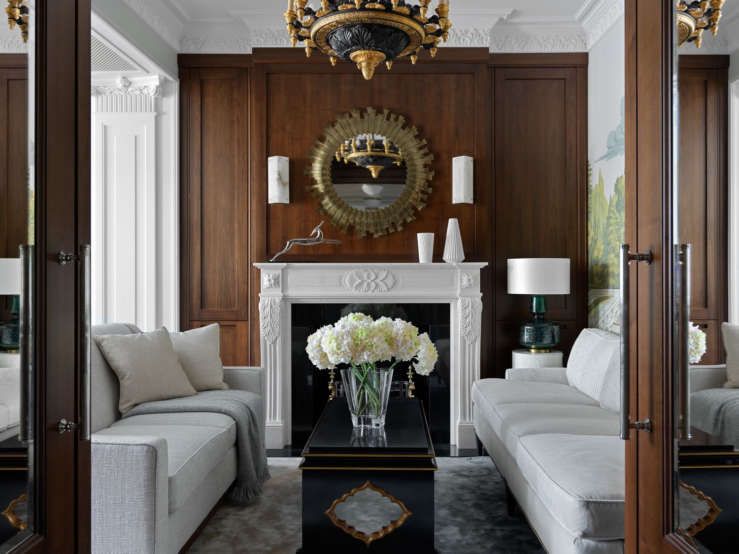 О проекте: Эта квартира площадью 120 кв.м расположена в доходном доме XIX века в историческом центре Москвы. Изначально она была задумана как классический «интеллигентный московский дом», хотя местами, конечно, наряднее, чем мы привыкли. И только главная спальня и ванная при ней сразу же вышли за рамки общей концепции — это осовремененная версия классического дамского будуара. У заказчиков было два основных требования: просторный парадный холл и не слишком большая по размеру гостиная. Особое место в каминной зоне занимает библиотека. Книжные стеллажи были выполнены по эскизам компании Olga Kushnareva-Leone Architecture & Design и, несмотря на общую классическую стилистику квартиры, получились очень лаконичными. Цветовая гамма построена на балансе классических цветов: зеленого — от травянистого до изумрудного и красного — от темно-кирпичного до алого на фоне нейтральных светлых оттенков. Цвет стен был подобран исключительно как фон для панорамных обоев de Gournay и мебели.
