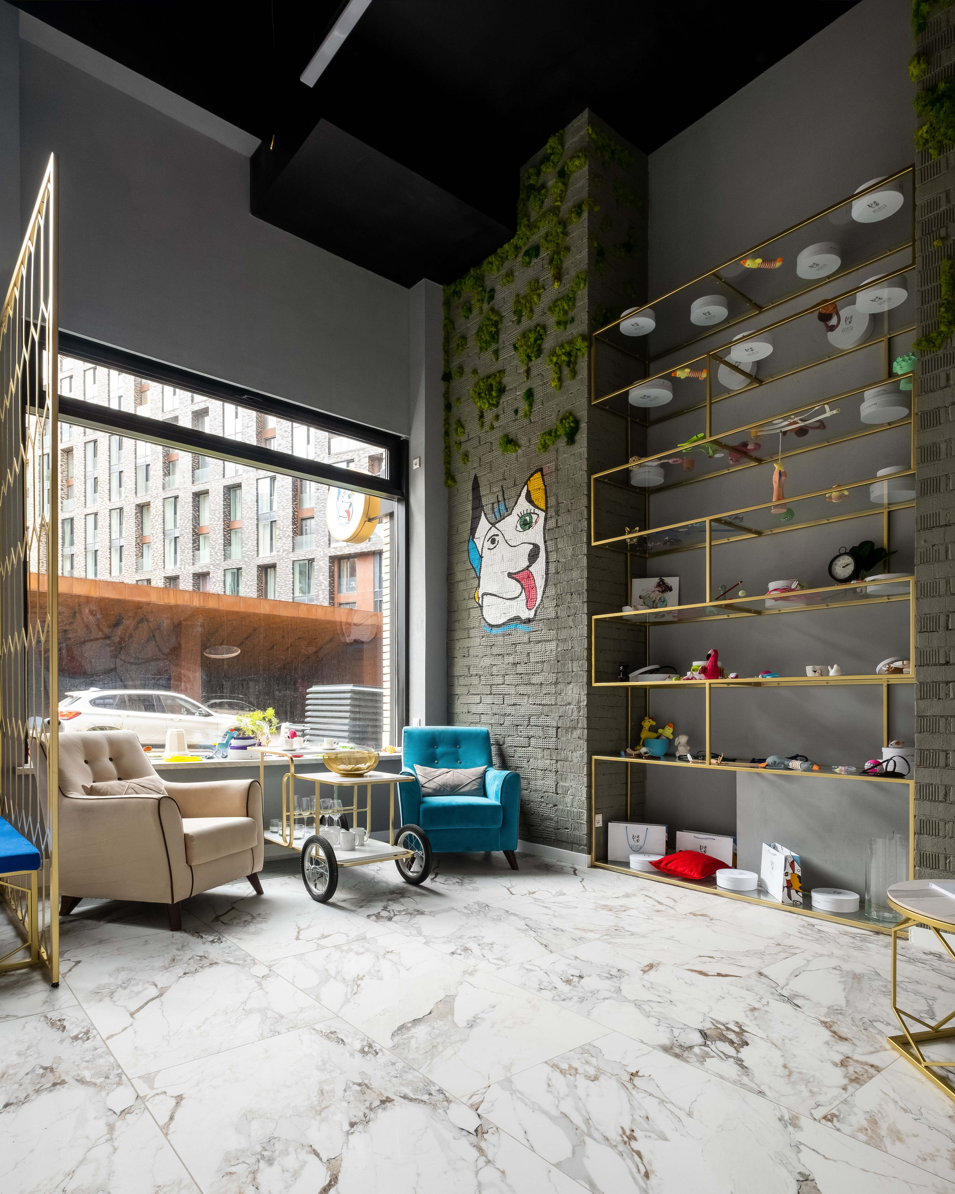 Помещение двухэтажное. Первый этаж – зал ожидания и техническая зона, второй –будущая школа для обучения грумеров. В дизайне спа-салона для домашних животных Picasso Groom преобладают кованые золотые элементы. Именно они добавляют в обстановку элементы современности и изысканности. Золотой цвет гармонично вписался в общую концепцию интерьера. При входе сразу расположено большое зеркало, обрамленное золотым металлом, и ресепшн. Там же - акцентная стена, расписанная вручную художником в стиле Пабло Пикассо, которая стала изюминкой салона. Стены из кирпича выкрасили в серый цвет, а затем украсили стабилизированным мхом.
