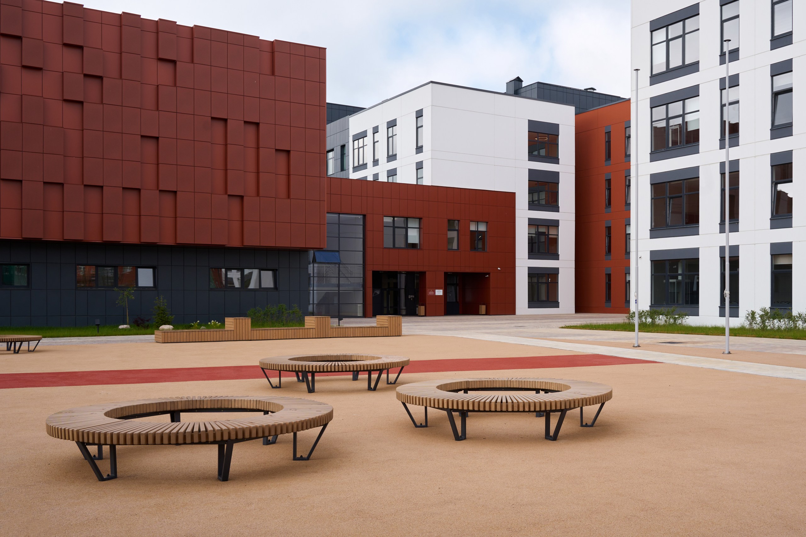 Конфигурация здания сформирована двумя 2-4-этажными геометрическими объёмами – основной учебной частью и блоком с актовым, спортивными залами, столовой и библиотекой. Два объема расположены под прямым углом друг к другу и делят территорию на внутренний двор и внешнее пространство школы. Благоустройство территории решено без доступа автотранспорта, кроме специального. В пересечении двух объемов находится основная входная зона, с внешней стороны вход для младших классов. Для МГН предусмотрен беспрепятственный доступ в здание с уровня земли, на путях передвижения предусмотрены беспороговые двери. Ключевым акцентом фасада является консольно выступающий объем актового зала, что создает выраженный рельеф. Композиция фасадов базируется на гармоничном, соразмерном единстве внешнего объема здания с пространством интерьеров и окружающей среды, которое способствует созданию художественно завершенного целого. Цветовая палитра экстерьера вдохновлена натуральными материалами и природными оттенками.