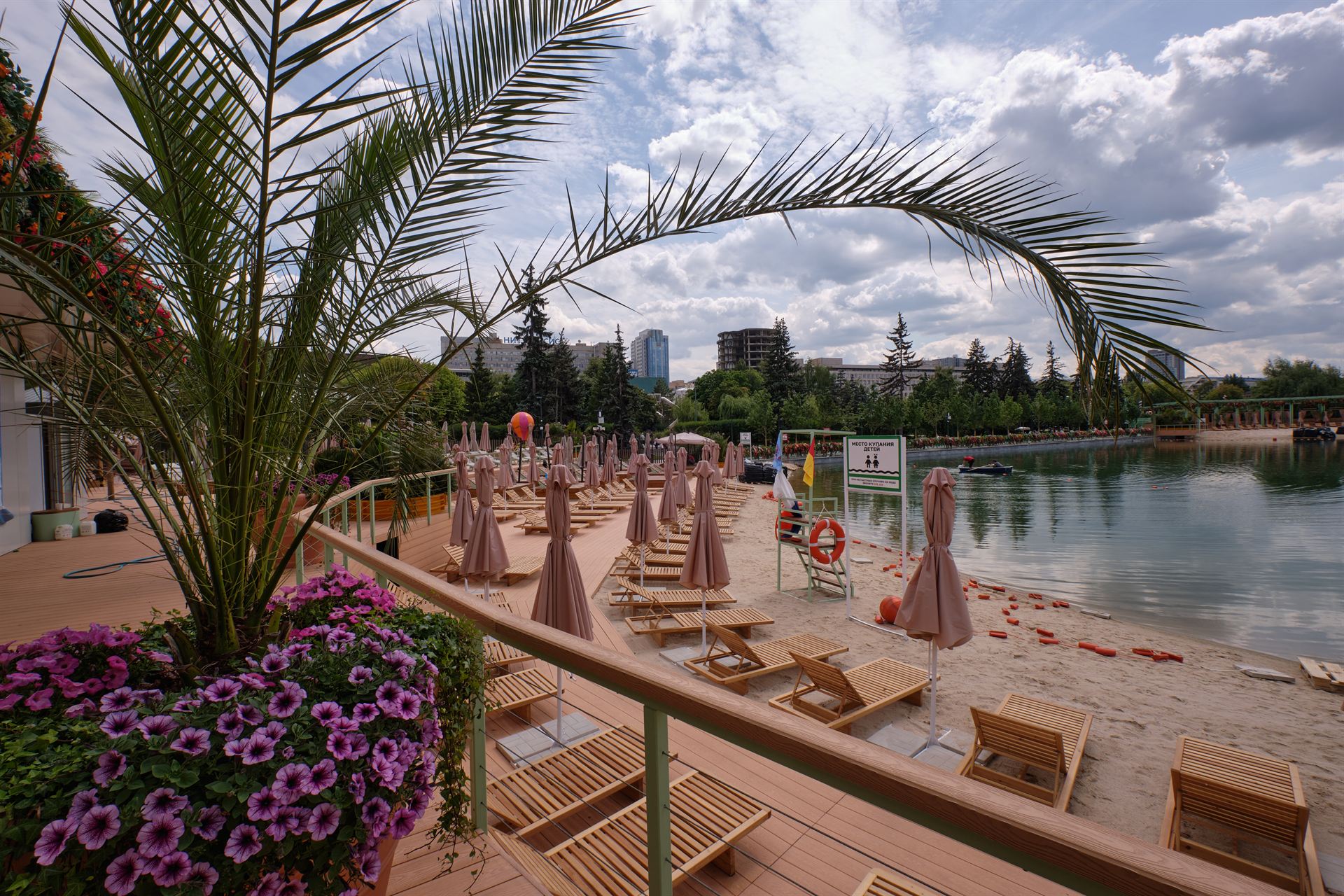 Берега пруда украсили экзотическими растениями, создав в центре Москвы пространство с необычной курортной атмосферой. Проект включает новые зеленые перголы, архитектура которых отсылает к архитектуре арки главного входа в Парк Горького. Для отдыха спроектирована и установлена необходимая инфраструктура: современные раздевалки, душевые, санузлы, кафе и детская площадка.