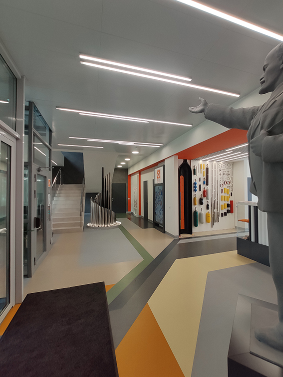 Общее визуальное решение интерьера вестибюля 1-го этажа выполнено в сдержанных тонах с яркими акцентами. Проработано общее и декоративное освещение с использованием линейных светильников, задающих направление и динамику помещению. Функциональные зоны выделены объемными и световыми инсталляциями. Навигация для посетителей выполнена в плоскости напольного покрытия различными цветами. Общее цветовое решение основано на бренд-буке предприятия.