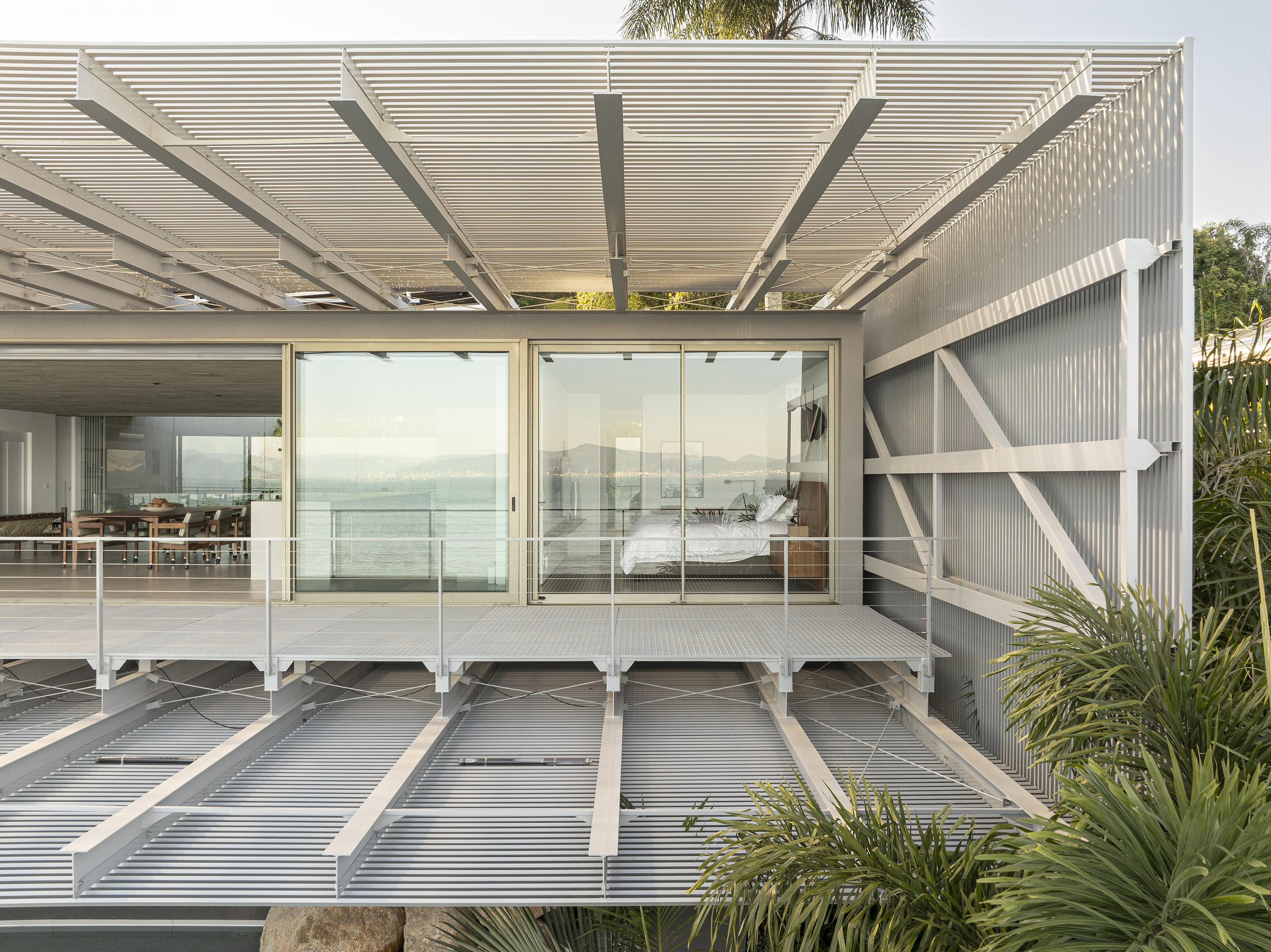 Флорианополис, остров на южном побережье Бразилии, славится великолепной природой, чистейшими песчаными пляжами и живописными скалами. Частная резиденция Понте-Хаус расположилась на склоне холма над морем в Какупе – одном из престижных районов Флорианополиса. Здание органично вписано в природный ландшафт, а гармонию внутреннего и внешнего пространства дома обеспечивает натуральный камень в отделке интерьеров. Стальные панели фасадов – отсылка к знаменитому мосту Эрсилиу Луж, соединяющему материковую часть города с островом. Их решетчатая структура позволяет создать нужную степень затененности. На верхнем этаже находятся общие зоны и спальни, а на нижней открытой террасе – бассейн и площадка для отдыха.