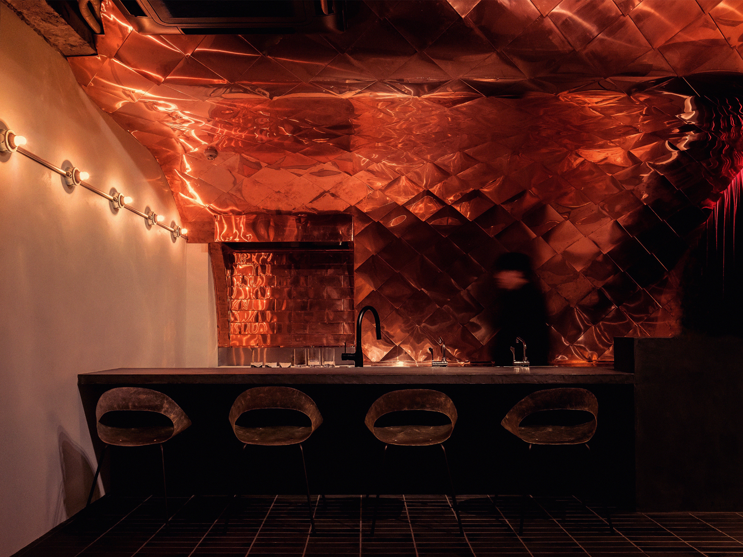 Описание проекта, предоставленное заявителем: Poppy Lounge — это небольшое арендное пространство с кухней, расположенное на третьем этаже старого многоквартирного здания в центре Нагои. Пространство создано как место для общения и совместного времяпрепровождения — здесь проходят как приватные ужины, так и поп-апы и культурные мероприятия. Ключевой элемент интерьера — потолок, покрытый более чем 300 фрагментами медной фольги толщиной 0,3 мм, уложенной в традиционном узоре «уроко-бари» (в виде чешуи), который создаёт сценическую атмосферу, усиливая ощущение присутствия и памяти. Центральный трёхметровый стол изготовлен из 100-летней древесины, спасённой из старого дома в Нагое. Легкие контрасты между винтажными элементами и современными деталями — такими как светильники и сиденья из стеклопластика — формируют пространство, в котором повседневное преображается. Это не про роскошь — это про глубину, юмор и запоминающийся опыт.