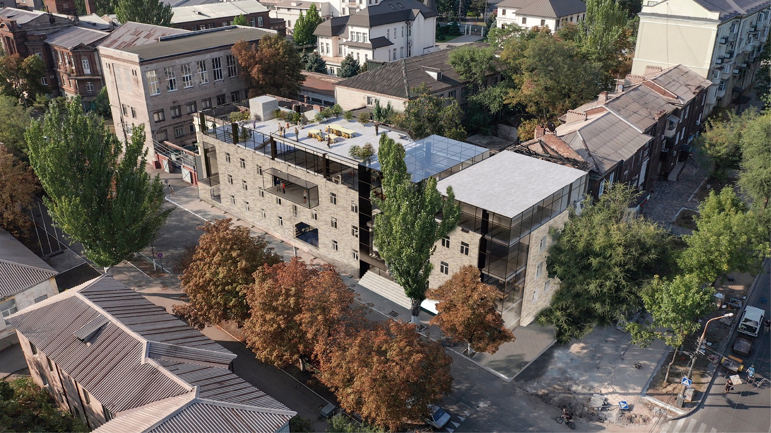 Участок застройки имеет важное значение для города с точки зрения истории, а в стоящем на нем здании происходили важные для города события. После того, как местные жители проголосовали за сохранение здания в существующем виде, встал вопрос о его реорганизации с учетом современной культурной повестки. Авторы предложили оставить внешние конструкции здания и разместить внутри него стеклянный блок на стальной раме, чтобы сохранить знакомый горожанам фасад. При этом в некоторых местах стекло будет выходить на первое место, создавая визуальную связь внутреннего и внешнего пространств. В обновленном здании предлагается разместить центр культуры – здесь предусмотрены образовательные площадки, зоны для общения и фудкорт.