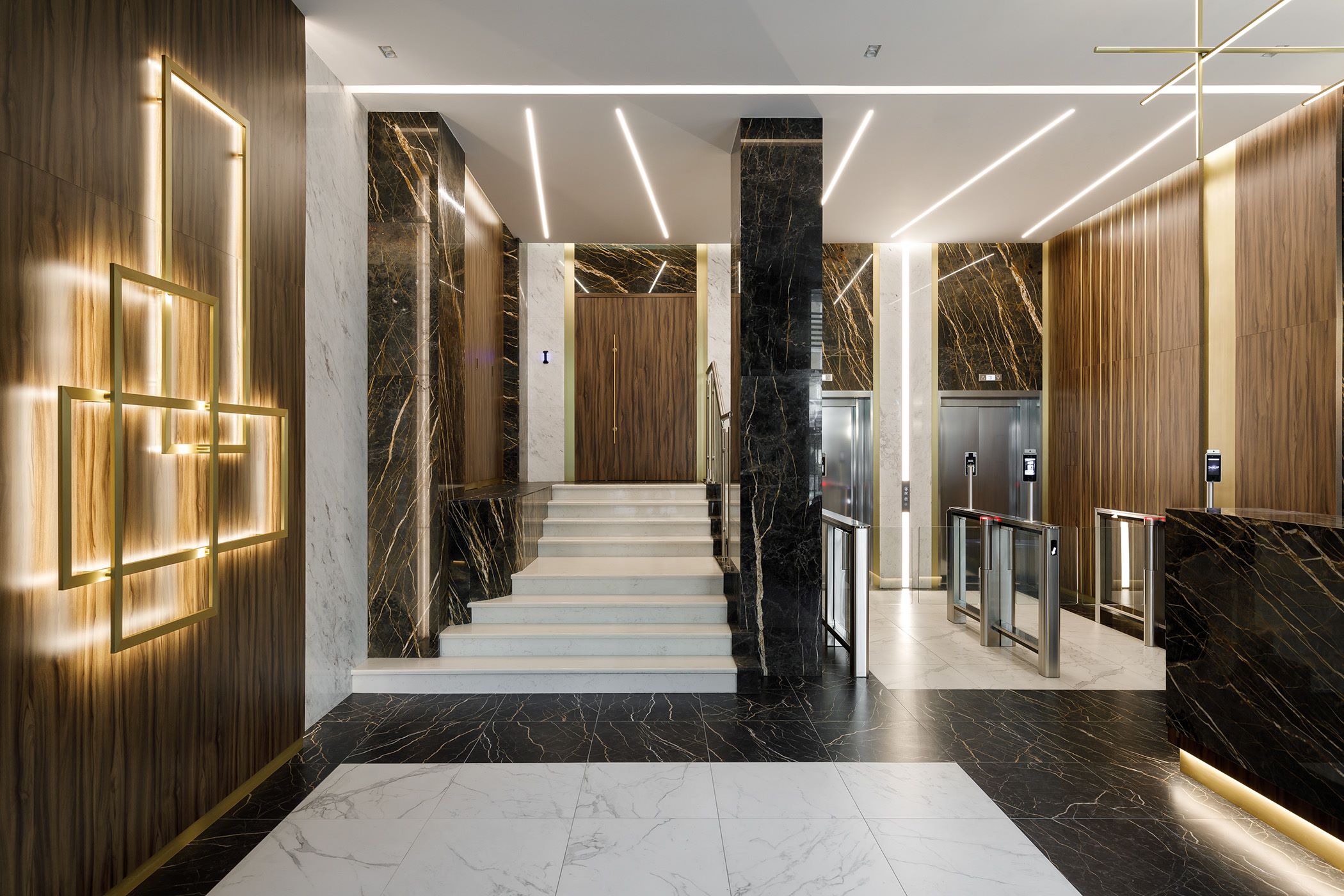 О проекте: Дизайн интерьера бизнес-центра построен на принципах ритмов и равновесия. Для респектабельности дизайнеры применили натуральные материалы: на стенах мрамор, шпонированные панели и вставки из благородной латуни, ступени из кварцевого агломерата. Мебель и светильники изготовлены по индивидуальным эскизам. Лифтовые холлы с мягким рассеянным светом являются стилистическим продолжением вестибюля.