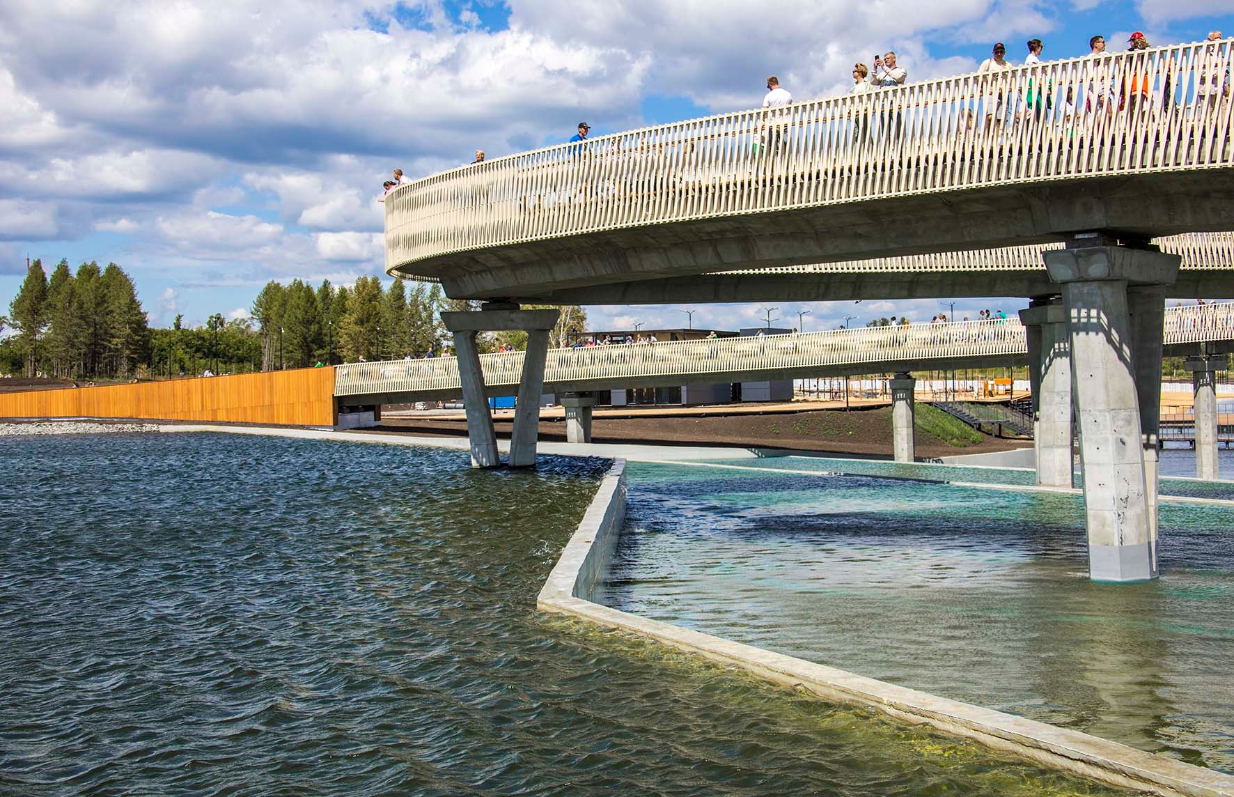 Мост расположен над искусственным озером городского курорта «Притяжение» в Магнитогорске. Освещение моста выполнено таким образом, чтобы при отражении от водной глади создавался эффект парящей конструкции. Изгиб моста подчёркивает его легкость и воздушность.
