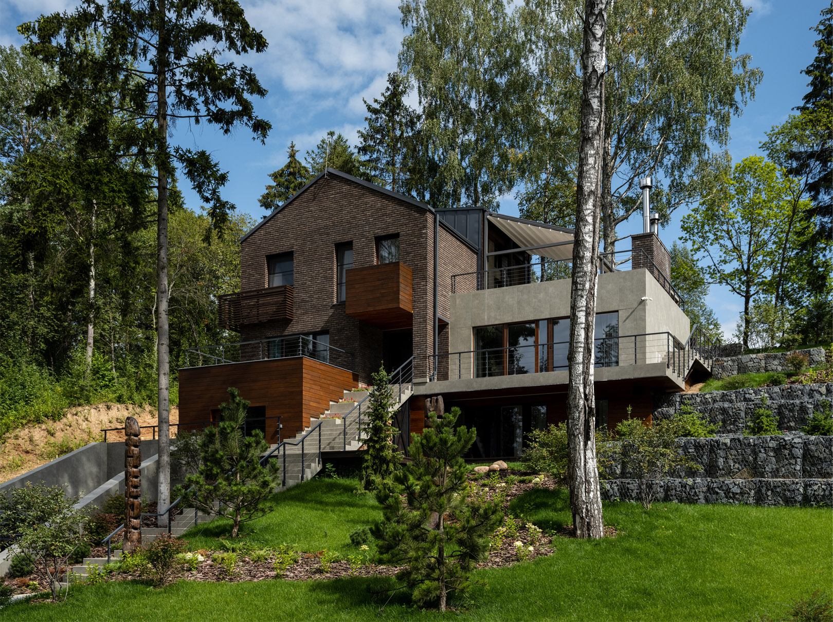 О проекте: Частный дом в закрытом коттеджном поселке в Подмосковье – проект, выдержанный в чертах минимализма, которые органично дополнены восточными нотами. Он разработан и реализован с учетом не только пожеланий заказчика, кинопродюсера Дмитрия Литвинова, но и особенностей природного ландшафта. Дом расположен на участке с нестандартным рельефом – крутой склон лесистого оврага, перепад высот достигает 12 метров. Дмитрий Литвинов выбрал этот участок неслучайно: ландшафт напомнил ему каньоны и холмы острова Бали, где он любит проводить время. Изучив необычный рельеф, заказчик решил построить на этом участке многоярусный дом. Разработку проекта Дмитрий Литвинов доверил специалистам бюро ab2.0 – авторам генерального плана коттеджного поселка и его архитектурного облика, от въездной группы до типовой линейки домов.