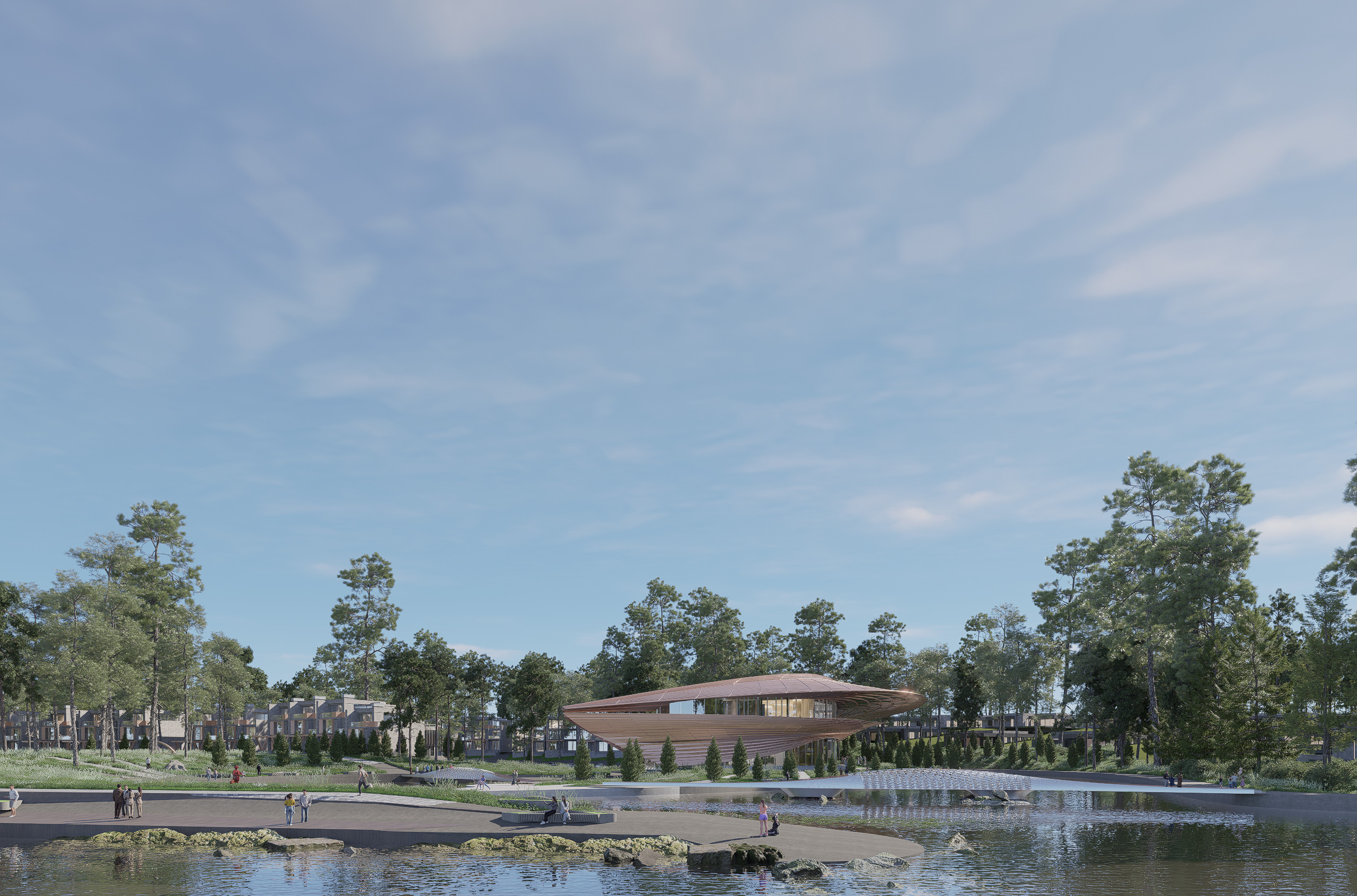 Волнообразная форма здания подчёркивает его связь с водой. Она напоминает форму кита или упавшего на воду золотистого листка. Золотисто-бронзовые панели служат ярким акцентом. Вытянутая форма обусловлена тем, что здание выполняет функцию моста, соединяющего два берега со сложным рельефом.