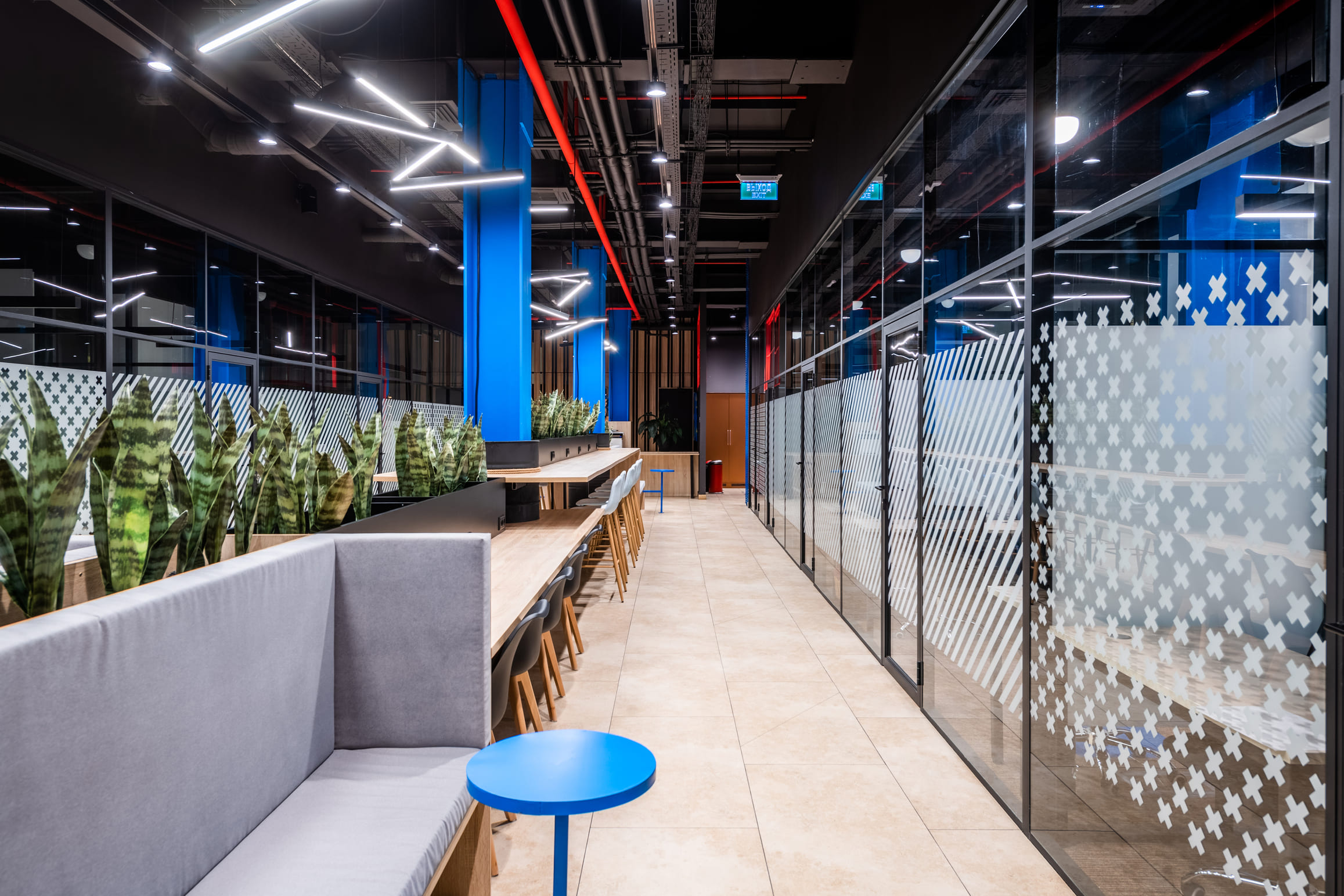 Общий концепт коворкинга создан в агрессивном урбанистическом стиле, напоминающем комиксы Marvel: неон, стекло и бетон, ломаные линии и контрастные акцентные цвета. Интерьер дополнен живыми растениями, фигурками bearbrick, картинами, яркими трубами, вентилями и цепями. Световая ломаная линия на потолке придает динамики, а паттерны на стеклах кабинетов зонируют пространство от публичного трафика. При этом, есть более тихие и спокойные лаундж-зоны: в стиле Бали и в стиле кемпинга.