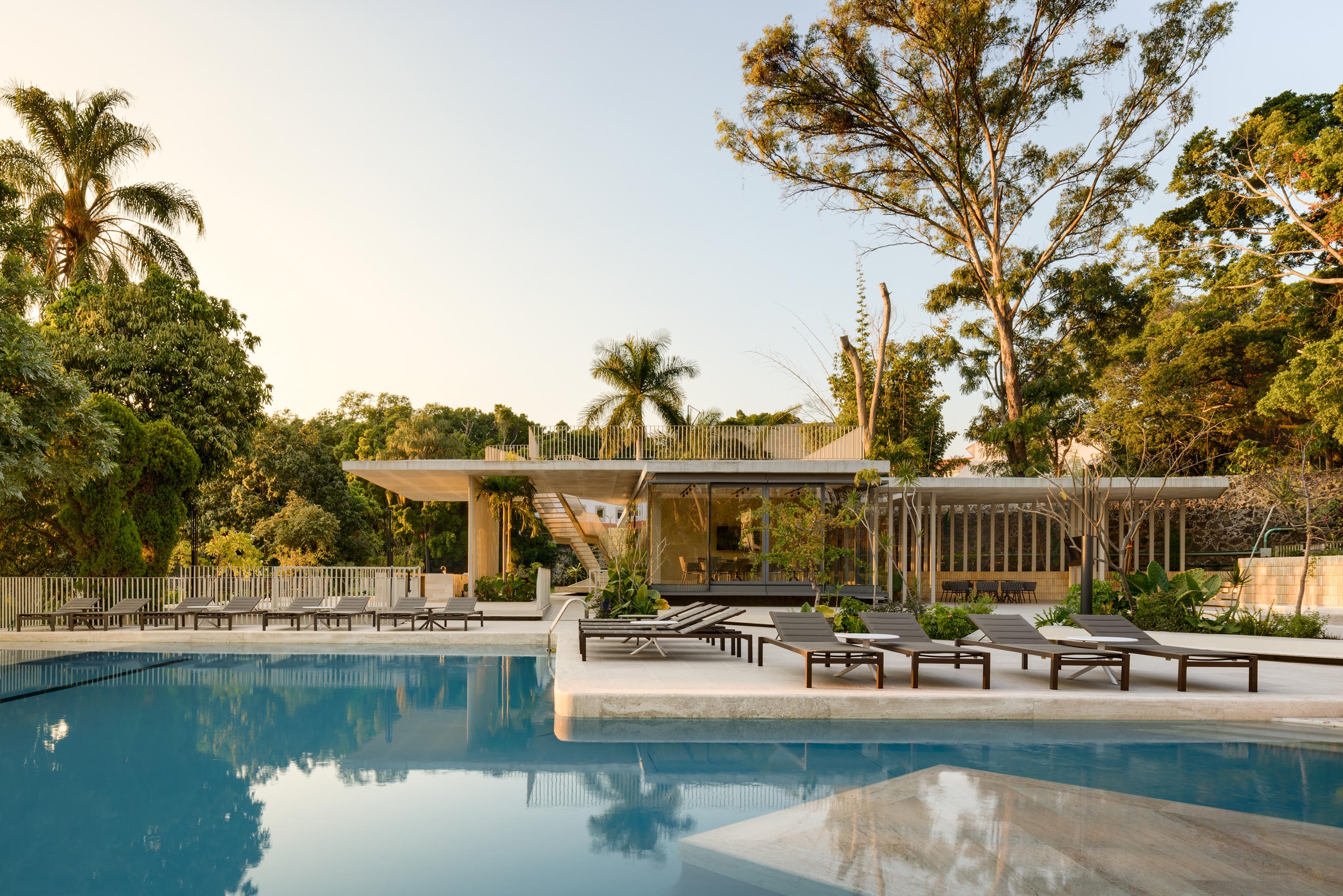 Опроекте: Дом на территории муниципального образования площадью 12500 м2, существующем с 1980 г. и насчитывающем 13 домов. Проект – отличный пример существования строительных объектов в гармонии с природой, где границы между внешним и внутренним стираются. Над открытыми пространствами установлены бетонные плиты, которые защищают от солнечных лучей и даруют необходимую в местном климате тень и прохладу. Использование стальных колонн добавляет объекту прозрачности. Фундамент приподнимает его над землей, оставляя пространство для зеленых насаждений.