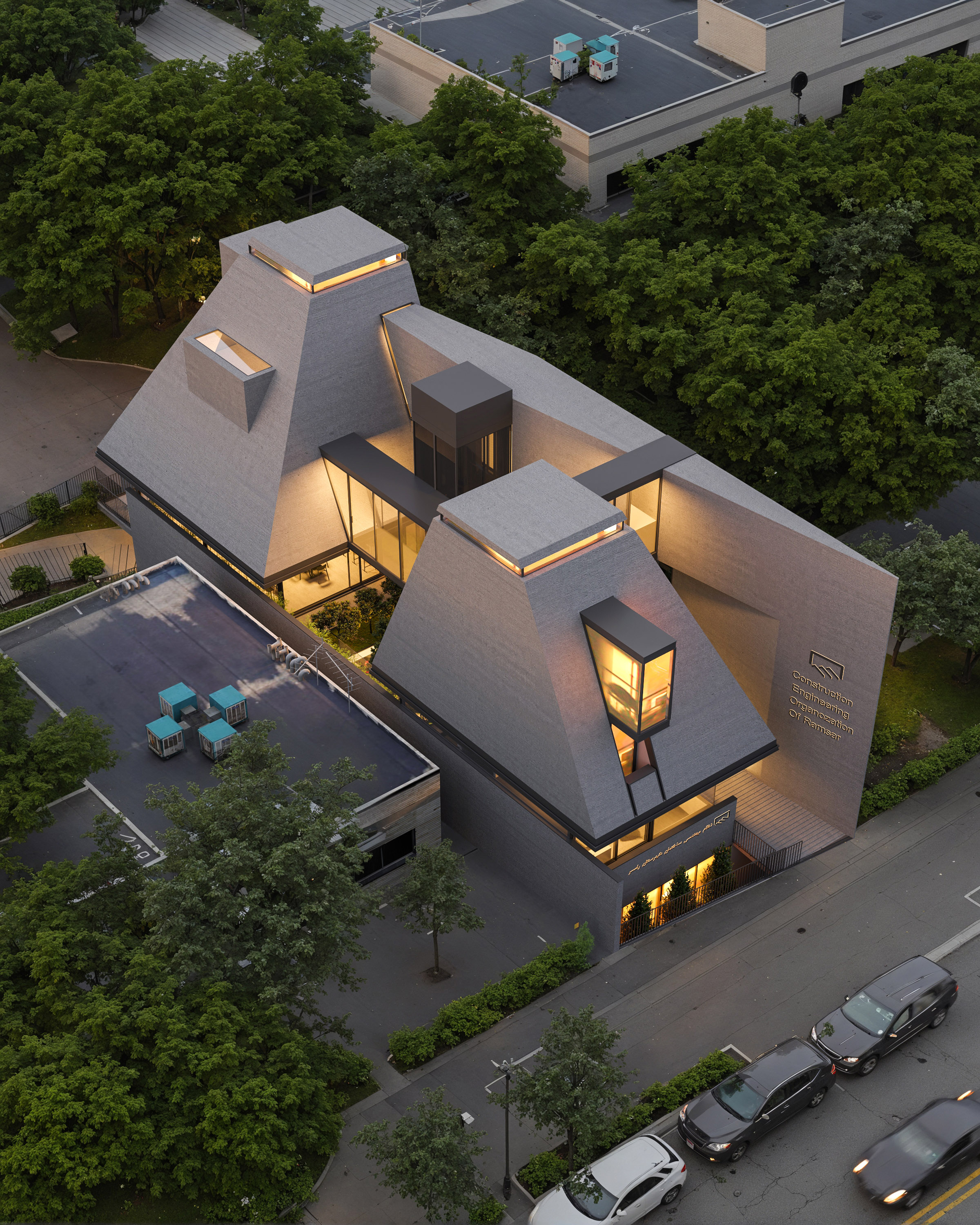 Описание проекта (предоставленное заявителем): Пирамидальная форма этого офисного / служебного здания была вдохновлена традициями местного зодчества. Поскольку климат на севере Ирана отличается высокой влажностью и дождливостью, архитекторы распределили функциональные блоки по участку вместо того, чтобы заключить их в более компактный единый объем. Блоки образуют подобие открытого коридора на уровне первого этажа, что в сочетании с благоустроенным двором создает необходимую визуальную связь. С южной стороны участка к дому ведет пешеходная дорожка, а автомобильный въезд предусмотрен с северной стороны.