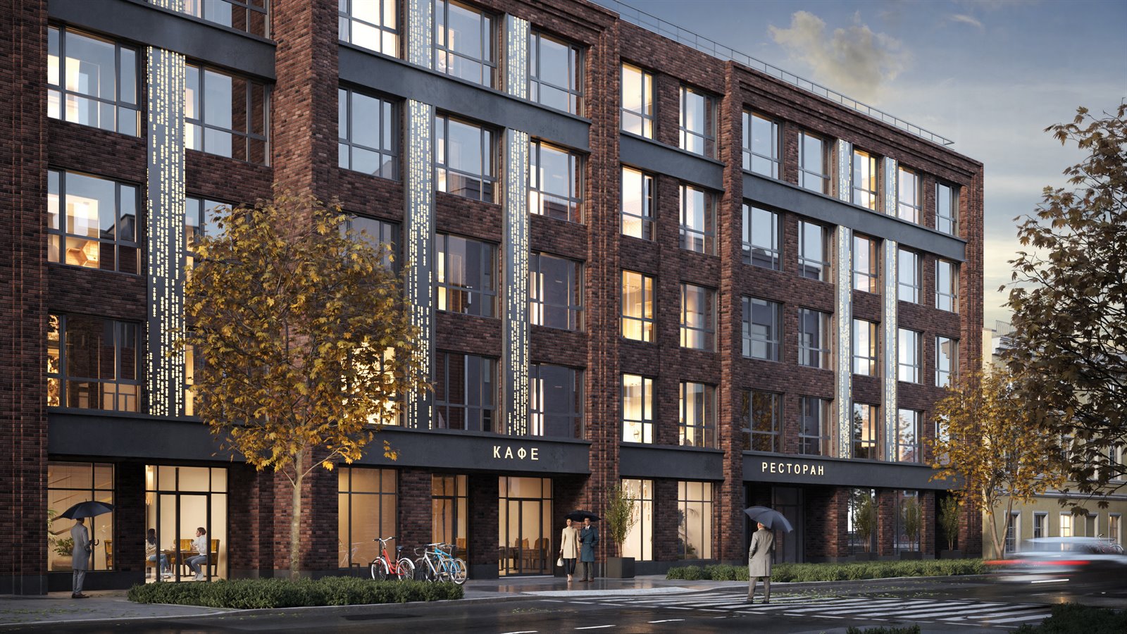 "Регенбоген" будет гармонично включен в этот исторический архитектурный контекст благодаря переменной этажности в 5, 7 и 9 этажей и лофтовым фасадам. Кирпич глубоких винных оттенков с выразительной текстурой, большие окна, черный металлический декор – как аллюзия на промышленную архитектуру начала ХХ века. Орнамент на фасадных просечных металлопанелях в виде зашифрованных сообщений, набранных азбукой Морзе на телеграфном аппарате Сименса, – дань истории места.