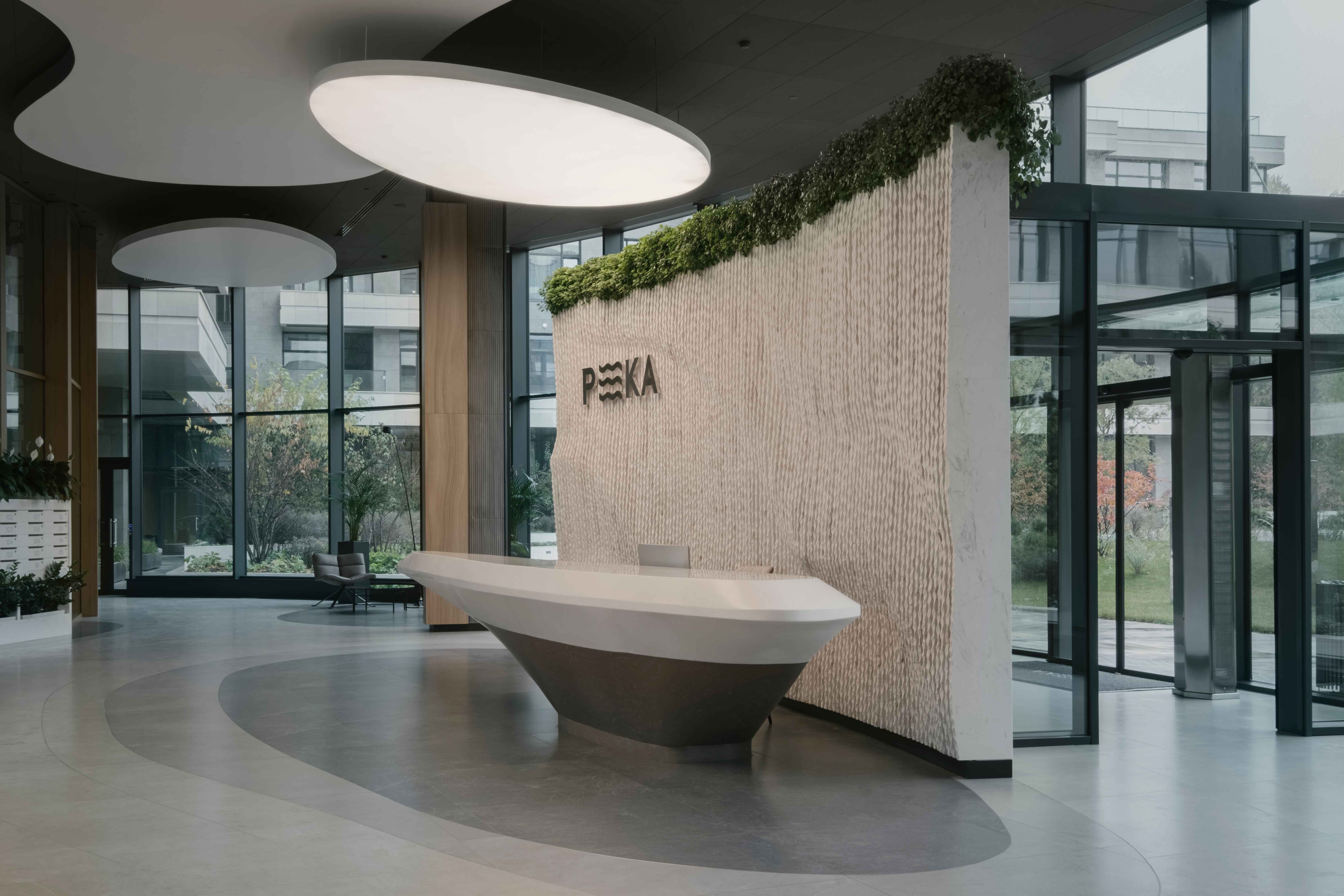 Интерьеры мест общего пользования клубного дома «Река» созданы VSA.studio совместно с Павлом Андреевым и ГРАН. Проект охватывает лобби, галереи, лифтовые холлы, коридоры, игровую и санузлы. Основная идея — интеграция с природным ландшафтом: панорамное остекление соединяет интерьер с окружением. Лобби и галереи — продолжение улицы, холлы и коридоры — камерные зоны. Две темы: светлая «деревянная» (природа, камень, дерево) и тёмная — контраст между открытым и приватным. Плавные линии пола напоминают берег, округлые формы — гальку и скалы, тёмные потолки с точечным светом — воду и ночное небо. Бетонные клумбы, зелень в почтовых ящиках и за стойкой усиливают природный образ. На потолке лобби — «облака» и «листья», совмещённые с освещением. Материалы - керамогранит (бетон на полу, дерево и панели на стенах) и фибробетонные рельефные плиты, оба соответствуют пожарным нормам.