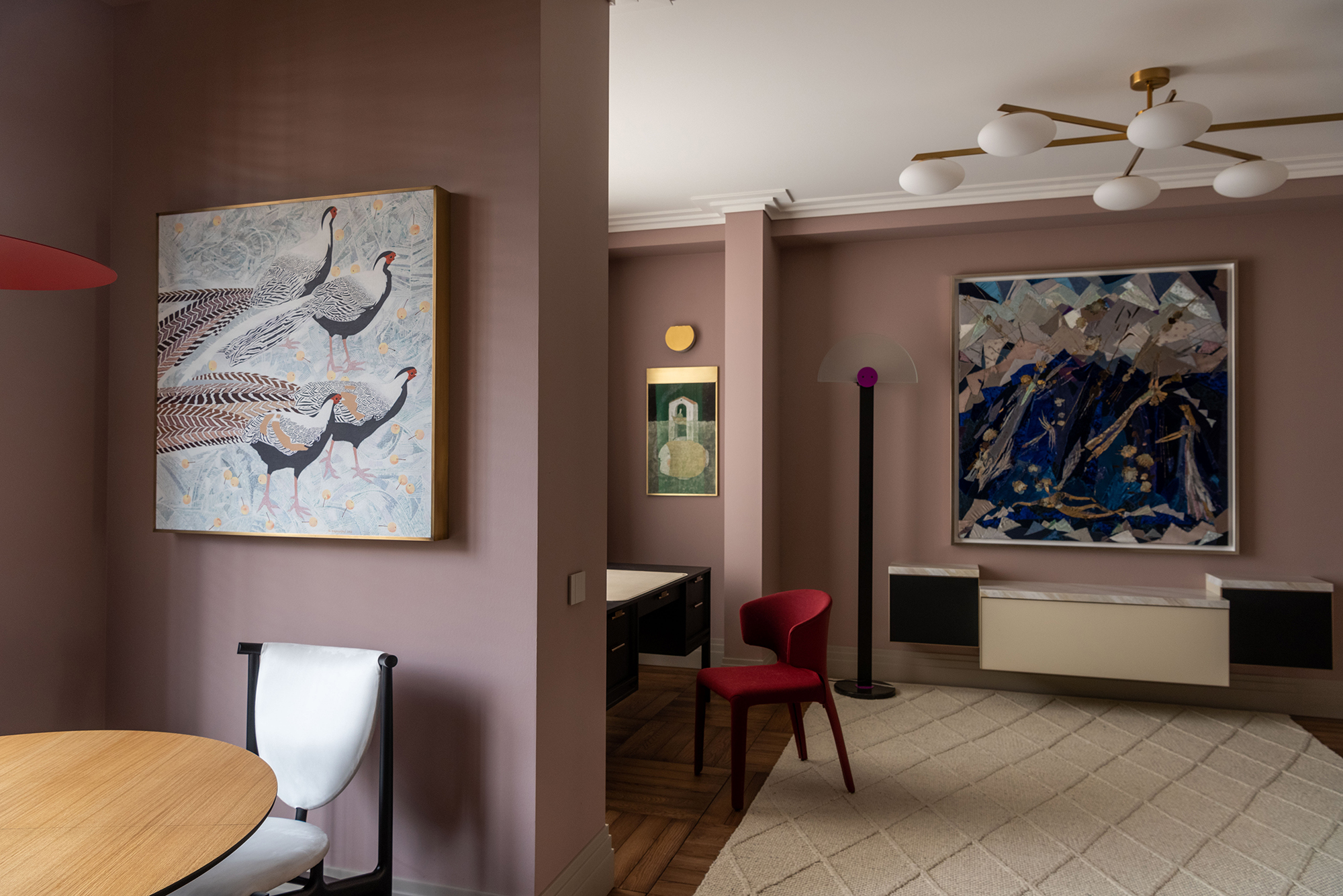 Заказчик – ценитель искусства, и был готов к нестандартным решениям. Задача состояла в подборе декоративных светильников, текстиля и изготовлении мебели по индивидуальным проектам. В квартире уже были дубовый пол, технический свет и комплект рабочей кухонной мебели. При дополнении коллекции живописи и оформлении работ сложность вносили архитектурные особенности пространства и имеющийся цвет стен. Для безупречного примыкания картины к стене разработан способ изготовления глубоких рам из листовой латуни, что решило проблему боковых ракурсов при развеске картин в коридоре и на фрагментах стен лоджии. Антикварное кружево скатерти, зафиксированное на подрамнике, превратилось в предмет высокого искусства. В проекте дивана для детской сделан акцент на нетрадиционные для современного мебельного дела материалы – мрамор и шелк; подлокотник с большим выносом позволяет использовать диван как рабочее место.