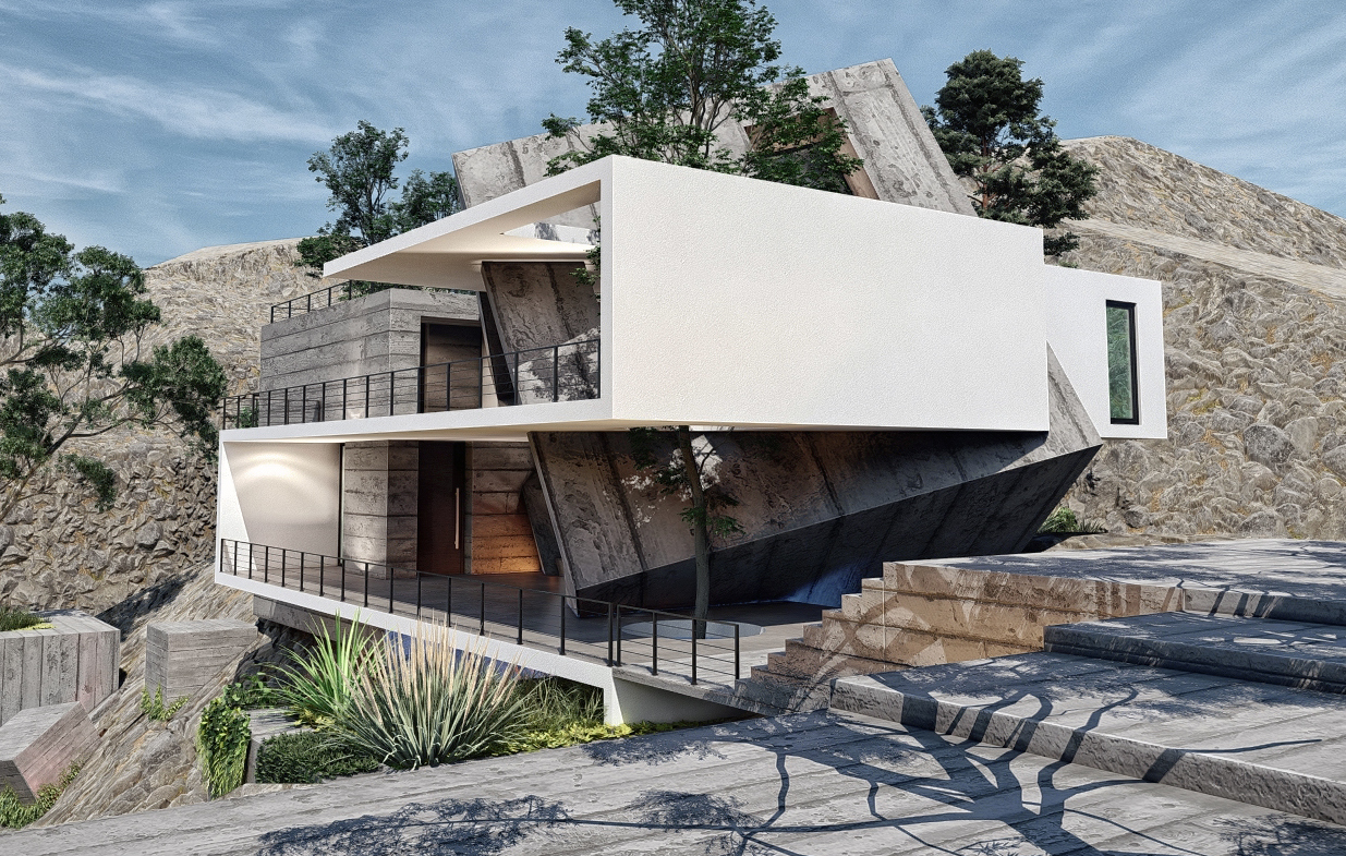 О проекте: Площадь застройки: 460 м2 Площадь участка: 750 м2 Концепция: Три кубических объема в ультрасовременном стиле пересекаются под немыслимым углом, образуя три этажа здания. Необработанный бетон выгодно оттеняет белизну гладких стен.