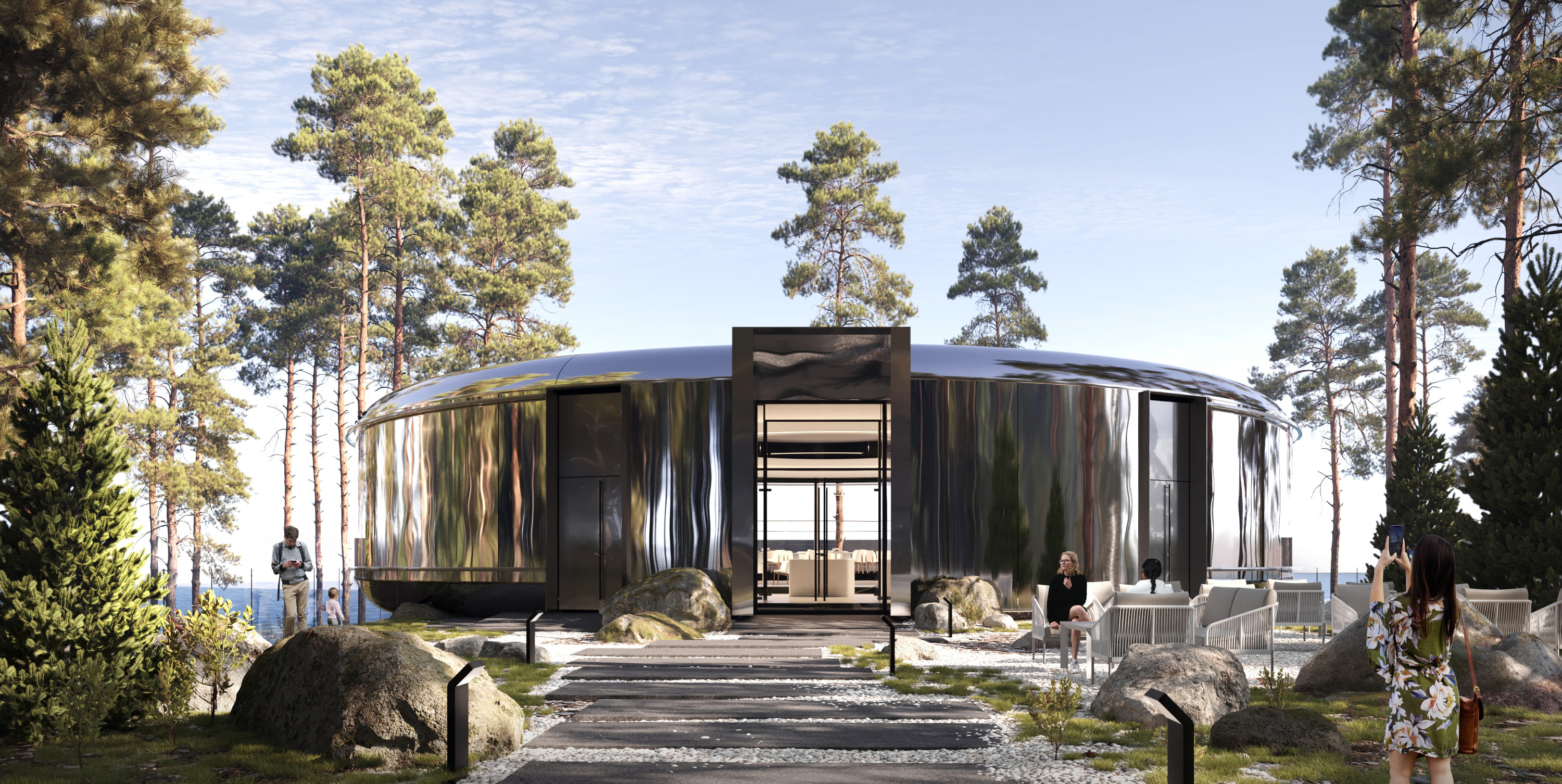 Тяжёлые гранитные стены и интегрированный в ландшафт стилобат являются основанием для современного лёгкого стеклянного панорамного объёма-шайбы. Контраст между природными материалами и современным технологичным дизайном является основой выразительности данного архитектурного образа.