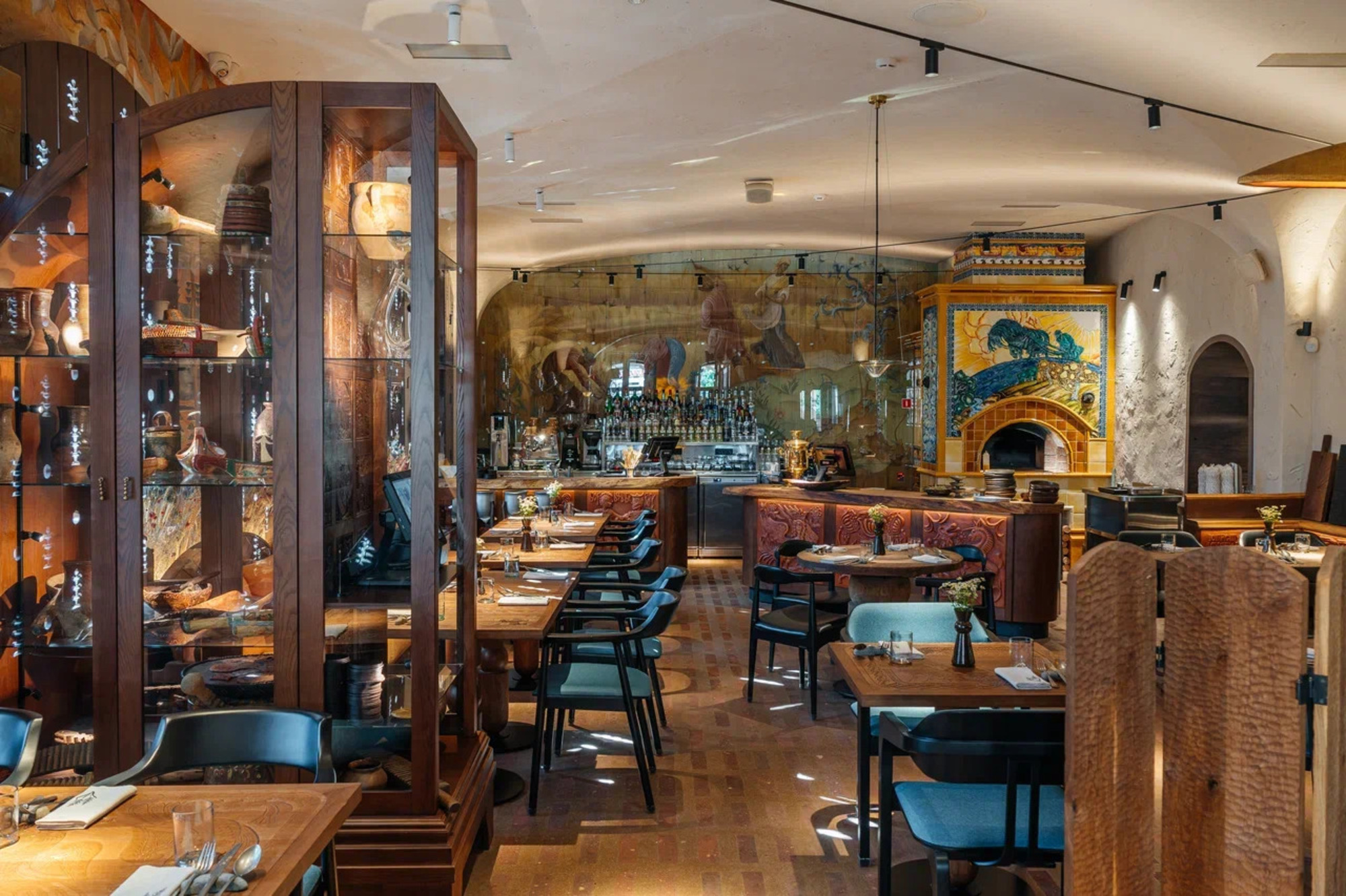 Центральный элемент ресторана - русская печь с двумя устьями. Светло-желтый цвет печи дополняется барельефным панно, центральный персонаж которого былинный богатырь-хлебопашец Микула Селянинович, крестьянин, возделывающий землю. В основе меню ресторана заложено использование локальных продуктов и специалитетов, собранных, выращенных и сохраненных в Центральном регионе России.