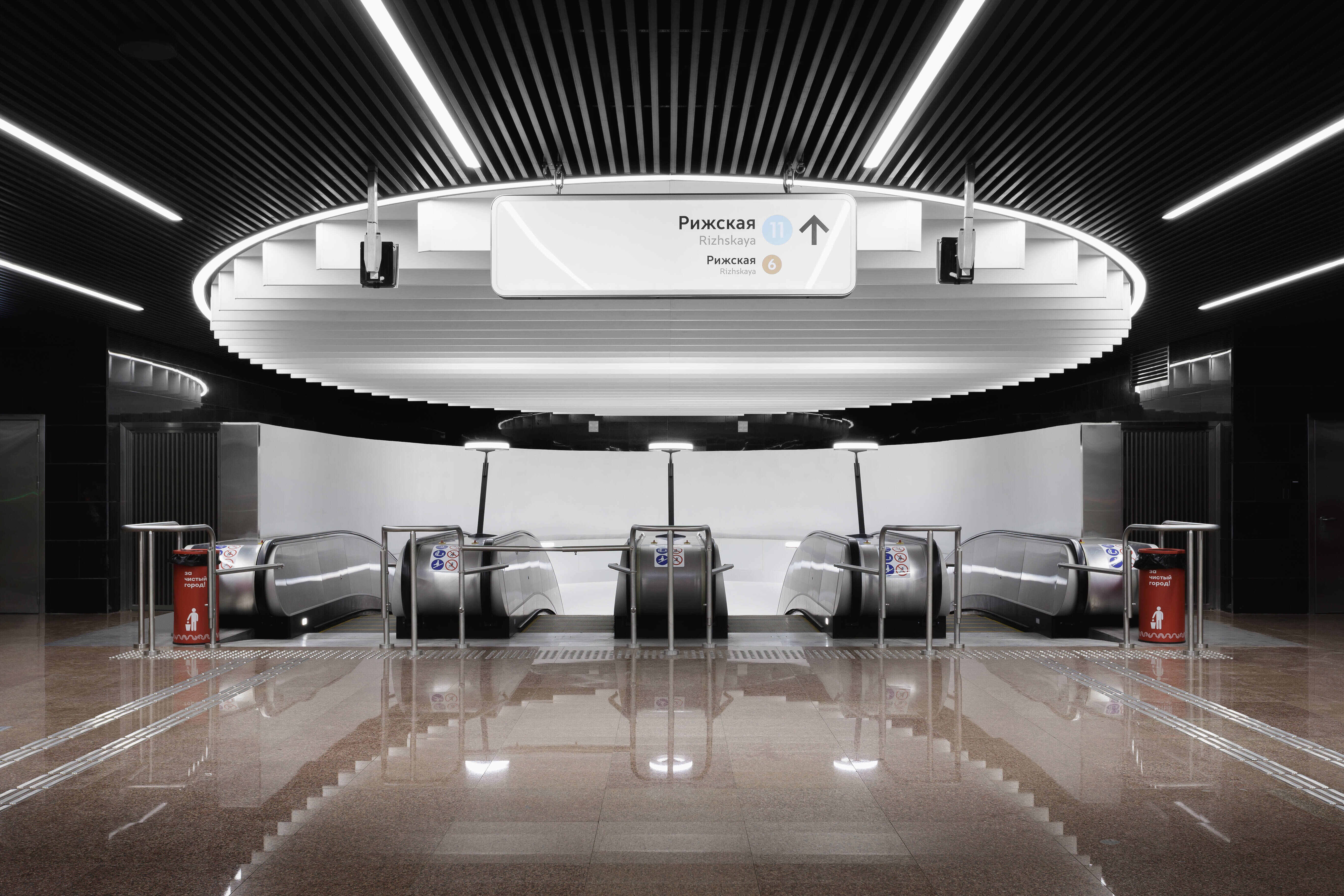 Отсюда – 16 порталов-арок высотой до 4 метров из нержавеющей стали, которые украшают вестибюль и платформу станции. Арки расположены последовательно и создают своеобразную галерею. Функциональная подсветка помогает пассажирам в наушниках понять, что к платформе приближается поезд. В облицовке станции использовали классический гранит, а путевые стены остались в первозданном виде: так «Рижская» визуально объединяется с другими станциями Большого кольца.