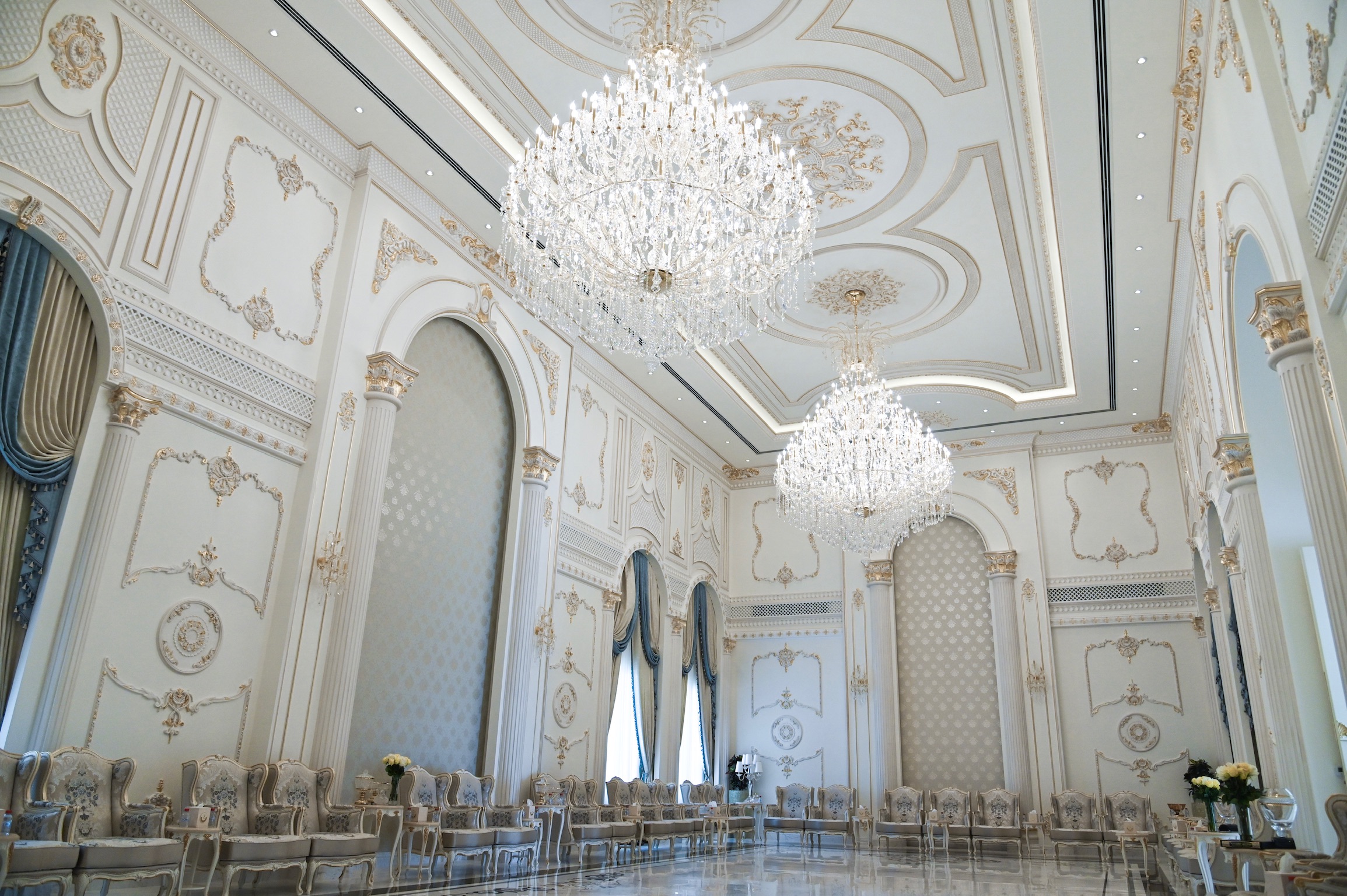 Стены с покрытием из стеклофиброгипса декорированы классической лепниной. Роскошный стиль дополняют полы из мрамора с водоструйной обработкой и обои тяжелой фактуры.