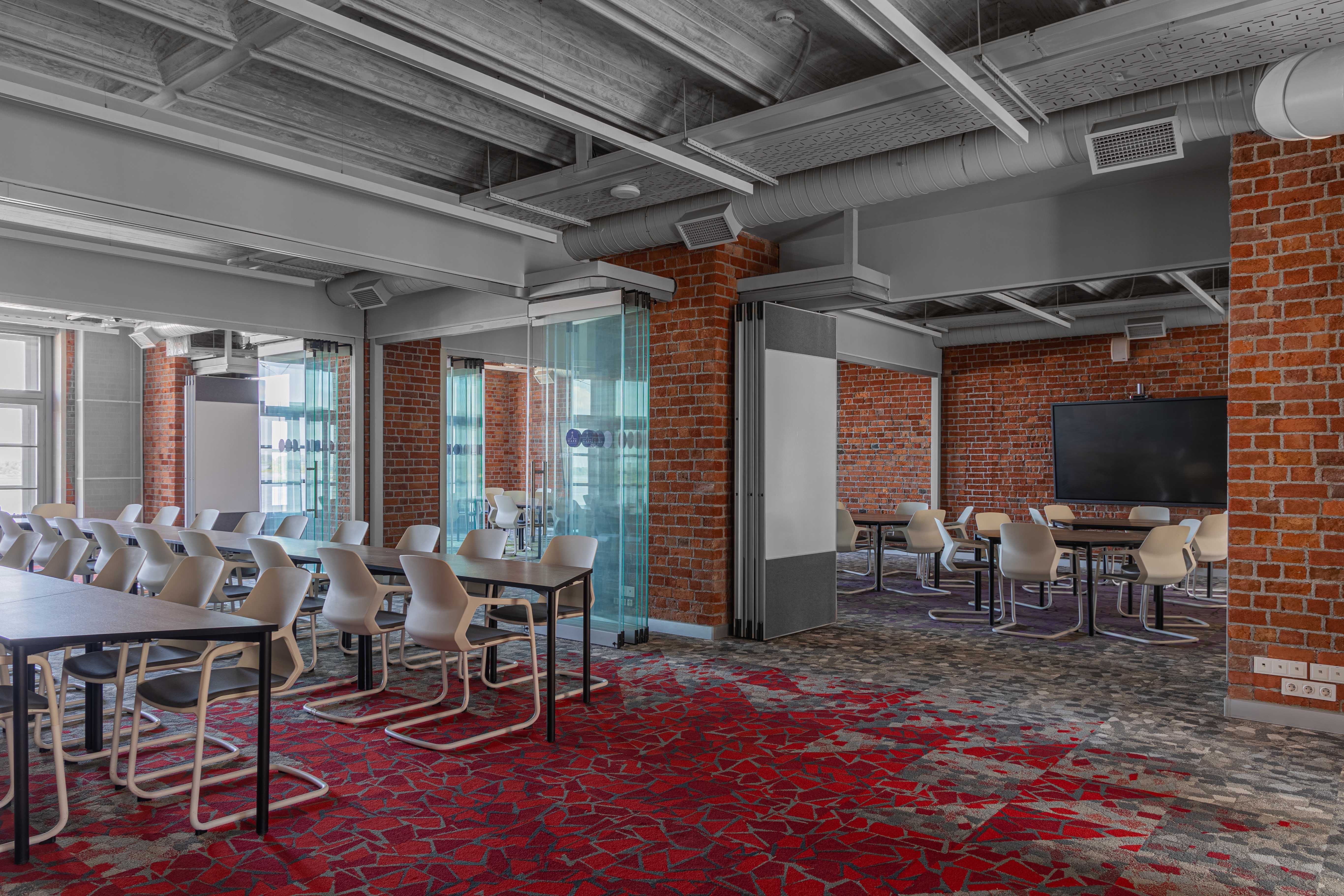 Второй этаж - офисная часть и образовательные залы, используемые под множество разнообразных сценариев и трансформируемые стеклянными перегородками.