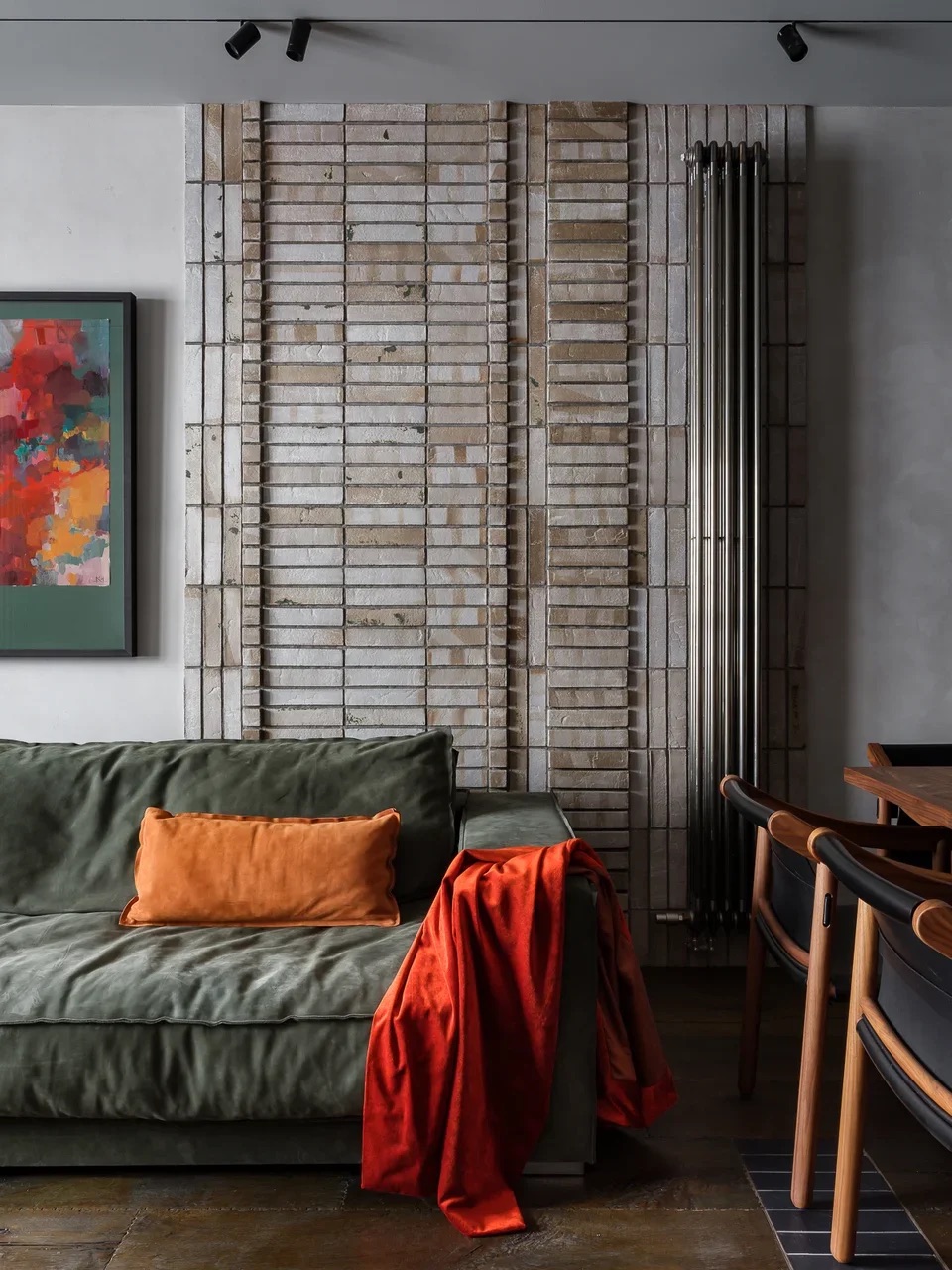 25 кв. м кирпича-клинкера на стенах в гостиной и «ковёр» из плитки на полу - керамика ручной работы, изготовленная в Moshkoff Studios по эскизам Екатерины Колеговой, как и как панно из плитки в ванной комнате на стене и на полу в гостевой.