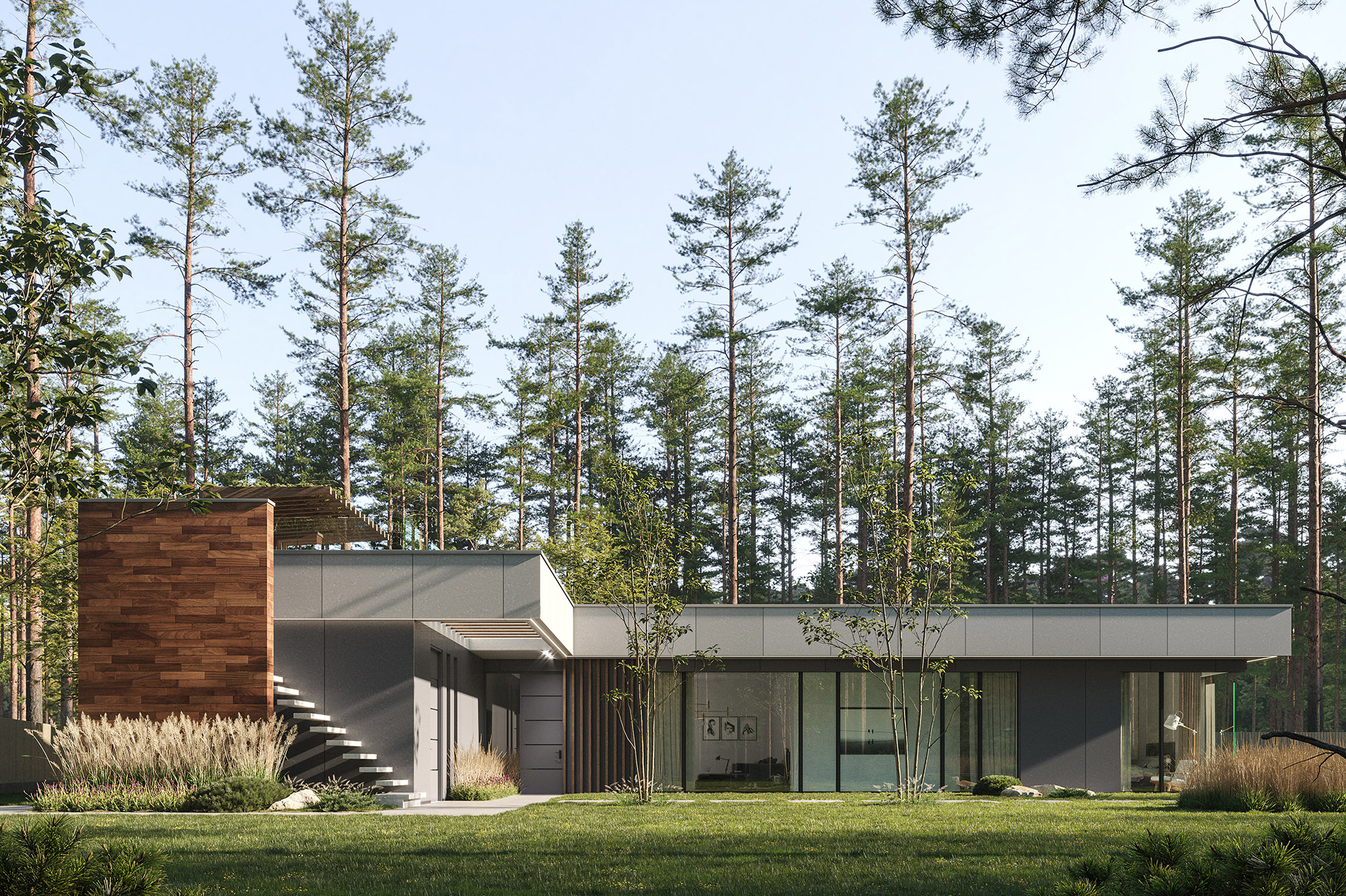 Проект виллы в стиле «хай-тек». Основной задачей было создание удобного пространства для отдыха и активной жизни. Формы, линии и используемые материалы дополняют друг друга. Панорамные окна и сочетание бетона с камнем и деревом способствуют установлению непрерывной связи между внутренними помещениями виллы и ее природным окружением. При выборе инженерных систем акцент был сделан на их современности, энерго- и затрато-эффективности, а также безопасности для здоровья. Использованные технологии гарантируют сокращение теплопотерь на 75%, что сделает пребывание в доме комфортным даже при -50°C. Эксплуатируемая кровля предназначена для отдыха и спортивных занятий.