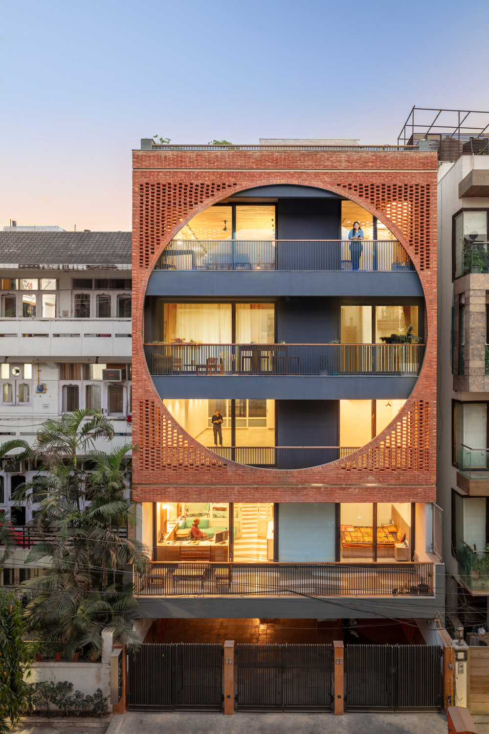 О проекте: На тихой улочке в Дели появился дом с кирпичным экраном, в котором выполнен круглый проем. На первом этаже предусмотрена парковка, а над ней расположены всего 4 квартиры. Согласно планировке, 3 ванных комнаты, 2 спальни и кухня располагаются в одной части квартиры (там же, где лестницы и лифты). Во второй части квартиры запроектирована просторная гостиная с двумя окнами, выходящими на разные стороны. Наверхнемэтажепредусмотреноткрытыйвнутреннийдвор.