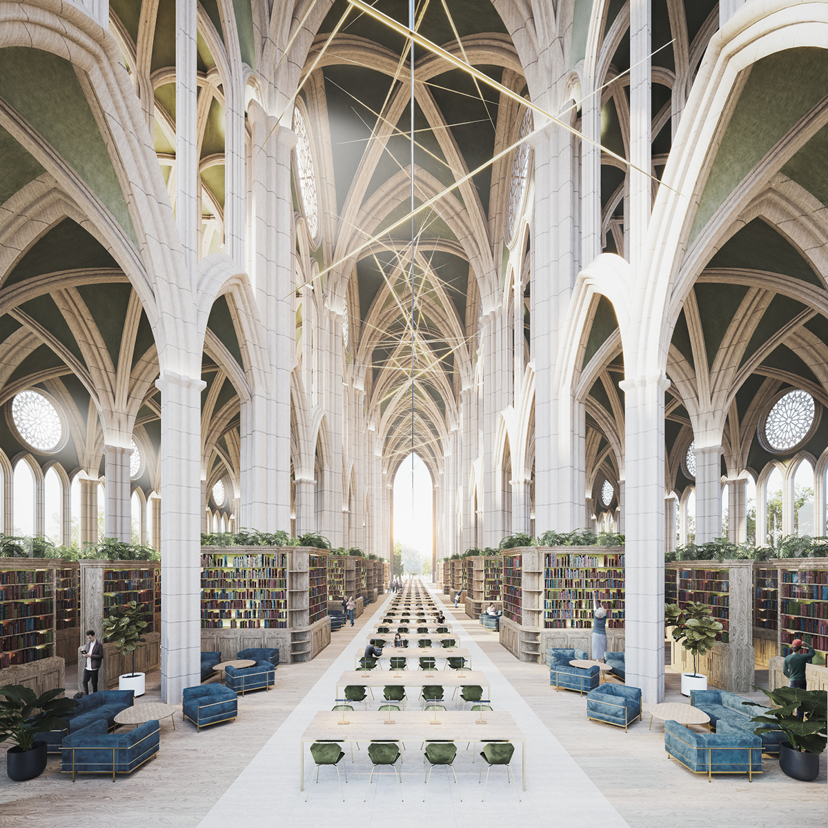 Особое значение в проекте отводится свету, который создает в здании особую атмосферу, проникая внутрь сквозь арки, круглые окна-розетки и стрельчатые окна. Еще одна отличительная черта проекта – дизайнерские книжные шкафы, выполненные из старых оконных рам.