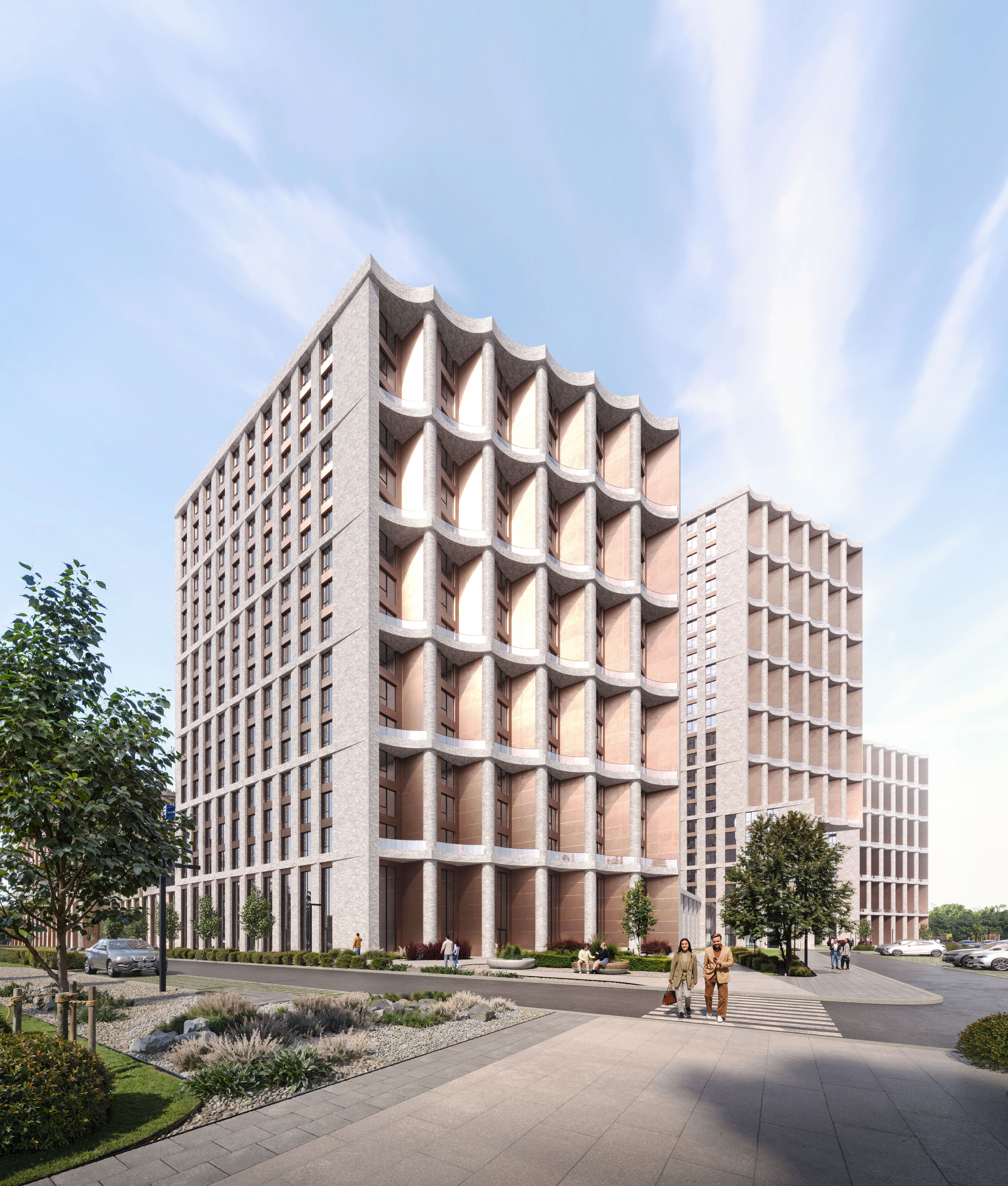 Лаконичная геометрия фасадов подчеркивает строгость и цельность ансамбля, а разновысотные корпуса формируют динамичный силуэт, узнаваемый в городской среде. Стилобат объединяет общественные функции и задаёт уровень взаимодействия с городом, формируя активное общественное пространство. Колоннада придаёт комплексу монументальность и пластическую цельность, создаёт зелёные маршруты для прогулок. Внутренний двор решён как приватный оазис: рельеф, растительность и камерная планировка обеспечивают атмосферу защищённости и уюта.