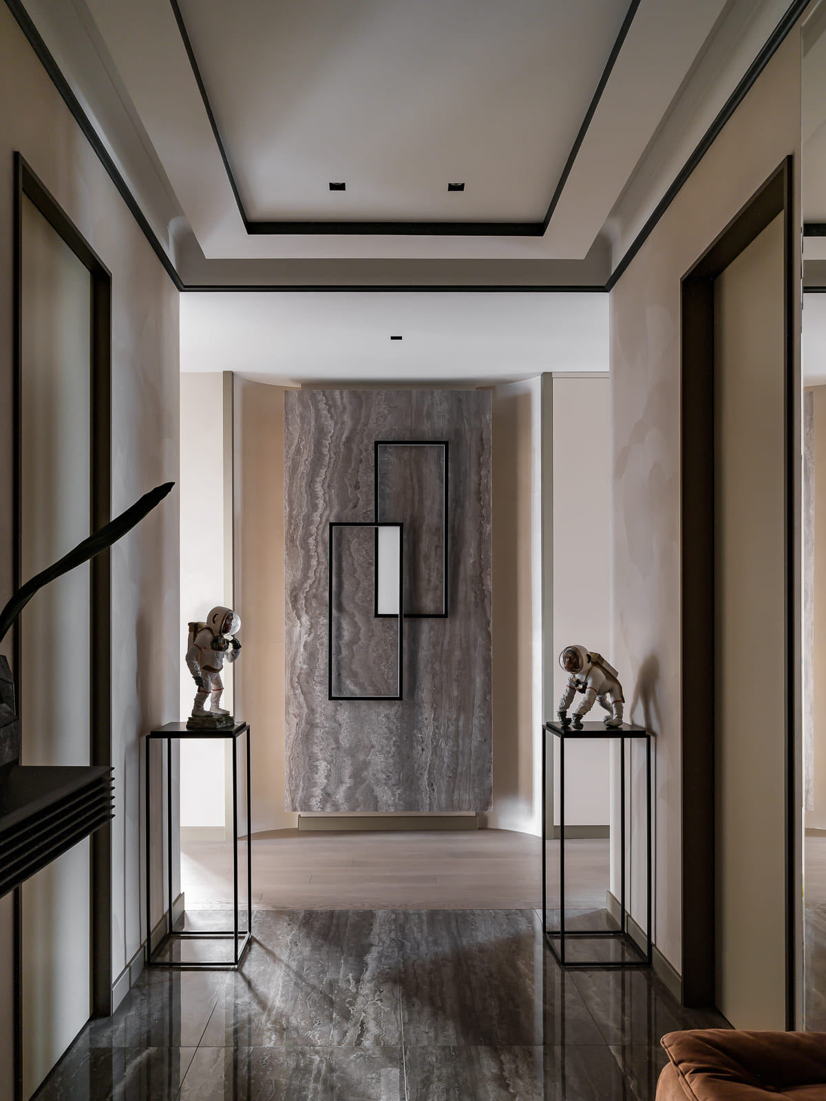 О проекте: Квартира в современном стиле в центре с панорамным видом на Москву. Для семьи из 4-х человек. Преимущественно авторы использовали теплую цветовую гамму и натуральные материалы: дерево, кожу, кварц.