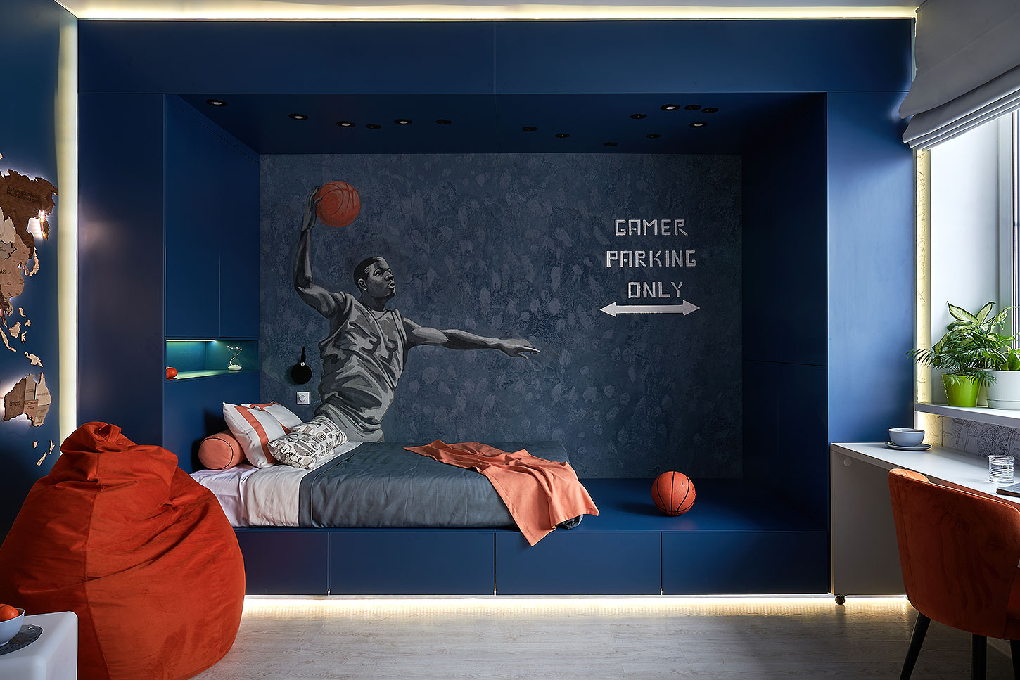 В проекте создано многофункциональное и трансформируемое пространство, которое с легкостью может адаптироваться под меняющие интересы подрастающего парня. Изюминкой интерьера стал портал: боковые колонны выполняют роль вместительных шкафов. Подиум стал удобным комодом с выкатанными ящиками. А на потолочной части портала появился кусочек личной вселенной в виде созвездия Скорпиона.