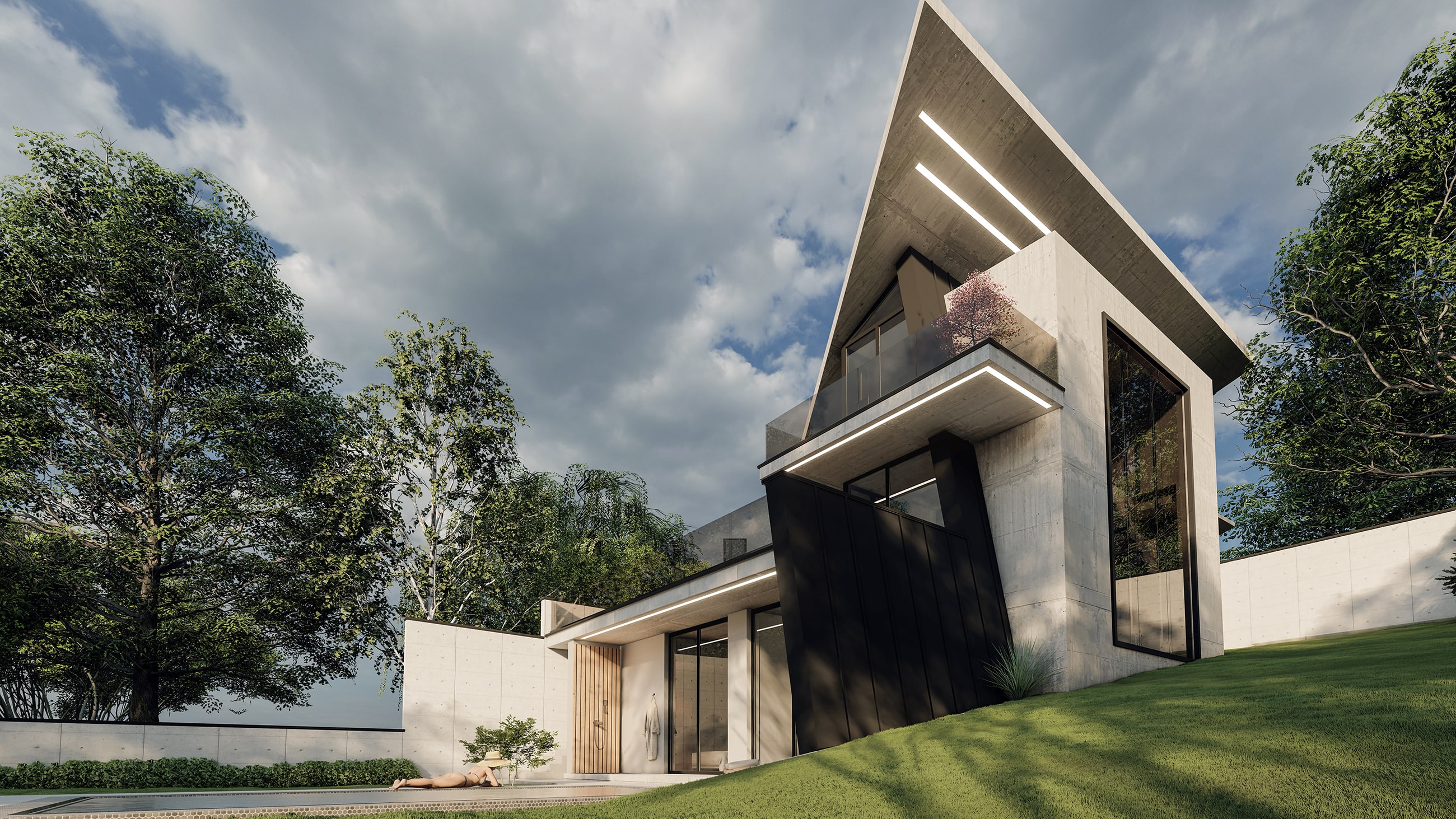 Вилла вписана в живописный горный пейзаж и проектируется в гармонии с окружающей средой. Для создания атмосферы уюта в качестве строительных материалов выбраны бетон и дерево, а панорамное остекление способствует единению с природой.