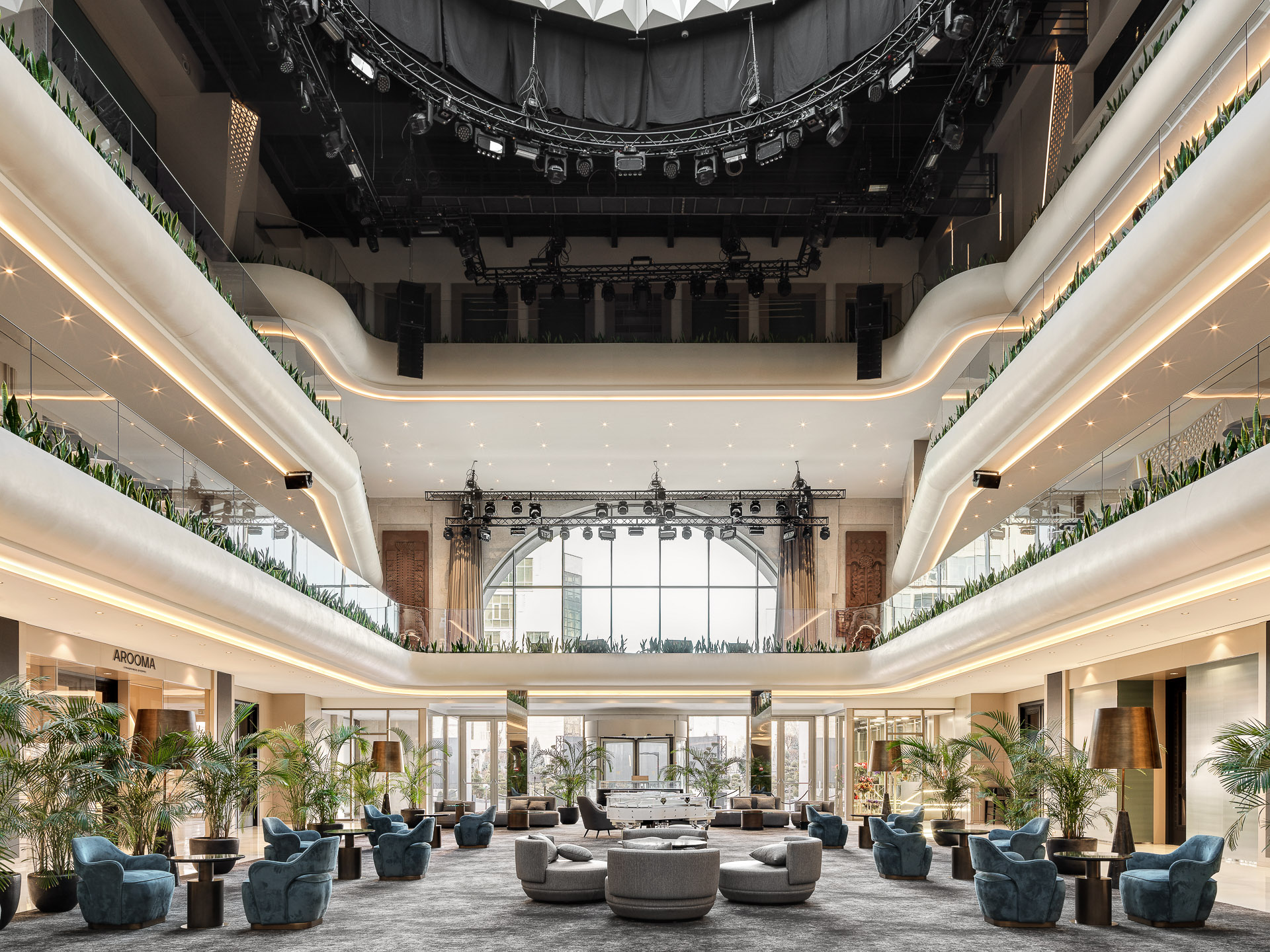 Архитектура и дизайн Seven Visions сочетают, казалось бы, несочетаемое: современный стиль и национальный колорит, поэтому в интерьере много света и тепла. Принципиальной в этом проекте была ставка на природные материалы, в первую очередь, дерево и камень. Интерьер оформляли мягкими теплыми оттенками, а также использовали много зелени, чтобы передать атмосферу щедрого южного гостеприимства. Поэтому дизайнерам пришлось изучить историю Армении и проникнуться ее культурой.