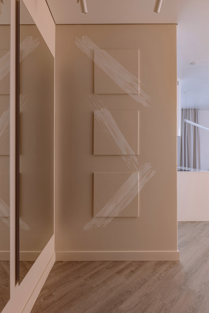 Описание проекта, предоставленное заявителем: Этот проект представляет собой идеальное сочетание изящной эстетики и простоты, объединенной неповторимым шармом японской культуры. Вдохновленные японской философией "вабисаби", была сделана ставка на минимализм и использование натуральных оттенков, чтобы создать спокойную и гармоничную обстановку в каждом помещении. Уже на входе вас встречают три холста, напоминающие искусство японской каллиграфии "Сёдо", когда каждый взмах кисти несет в себе смысл. Эти три штриха на холстах повторяют композицию из подвесных светильников в обеденной зоне, если посмотреть на нее сверху. Пространство помещений сведено преимущественно к монохромной гамме, с преобладанием бежевых и белых оттенков, но при этом мы оставили место для разнообразия фактур – в одном помещении можно встретить дерево, бетон и камень, однако большинство фактур покрашены в цвет стен, чтобы обилие деталей скрывалось при первом взгляде, а лишь раскрывалось при детальном изучении или под разными источниками освещения.