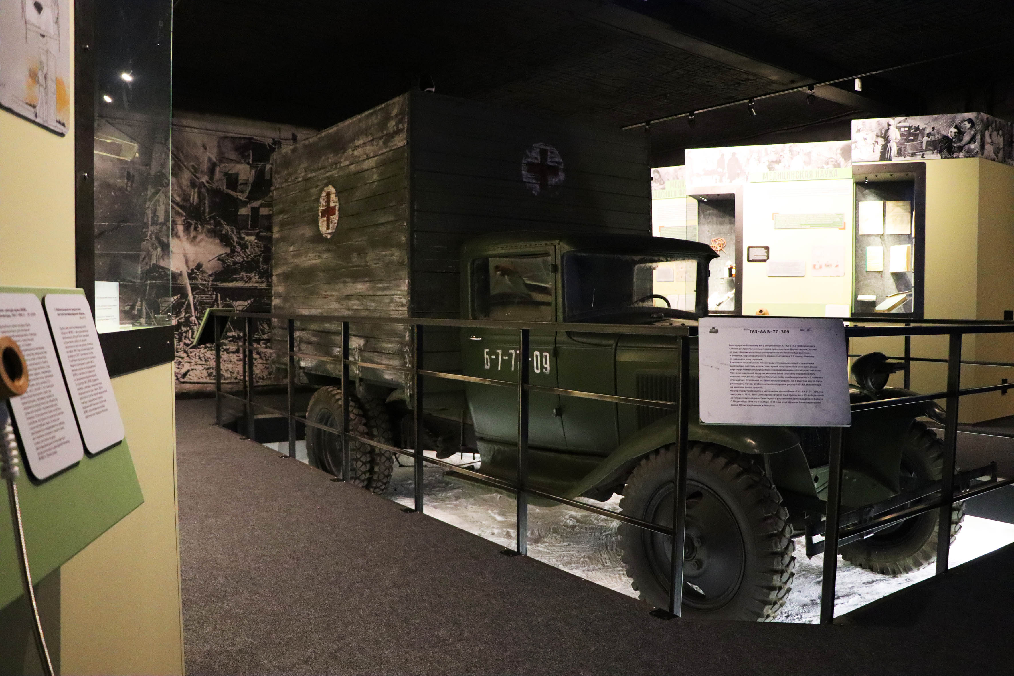 Музей блокадной медицины, площадь которого составляет более 100 кв. метров, объединяет свыше 40 экспонатов, а также 9 видеорассказов и аудиоисторий о жизни врачей блокадного города. В центре экспозиции — инсталляция, которая представляет отреставрированный санитарный автомобиль ГАЗ-АА. Именно эта легендарная «полуторка» в годы блокады вывезла по Дороге жизни более 20 тысячи больных и раненых.