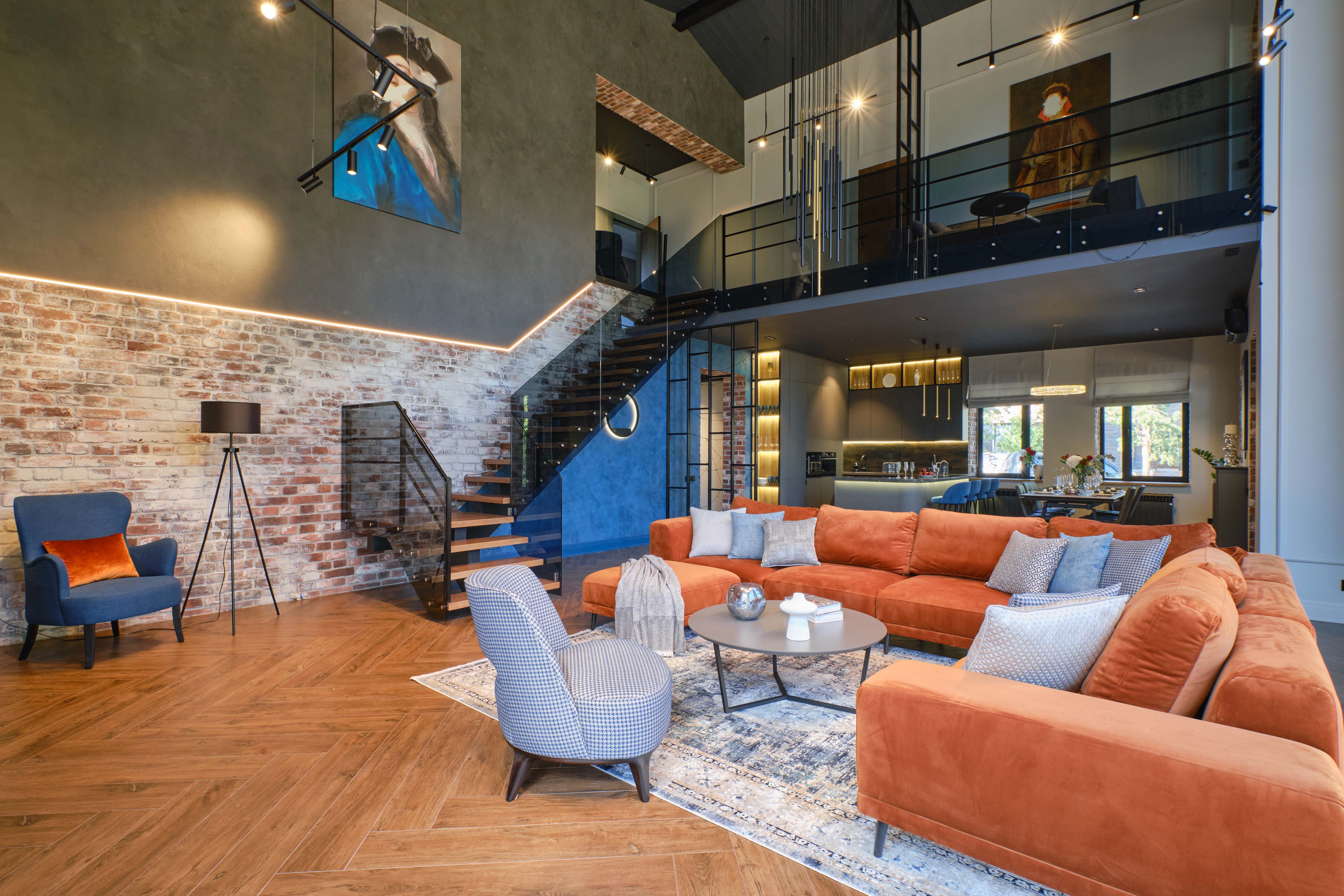 Загородный дом «Синий утес» предназначен для сдачи в аренду под различные мероприятия (свадьбы, выходные с семьей, дни рождения и т. д.). Для такой задачи было предложено сделать большое пространство кухни-гостиной-прихожей, в котором располагается много зон для встреч и общения (обеденный стол, большая барная стойка, большой модульный диван, который легко переставлять в разные композиции, диван в прихожей, диван на балконе и т. д.). Также в доме расположены три спальни, в каждой из которых есть большая кровать и дополнительное спальное место в виде раскладного кресла, свой санузел, шкаф и телевизор. На первом этаже также располагается общий санузел, игровая комната для детей, хозяйственная кухня для кейтеринга и выход в гараж.