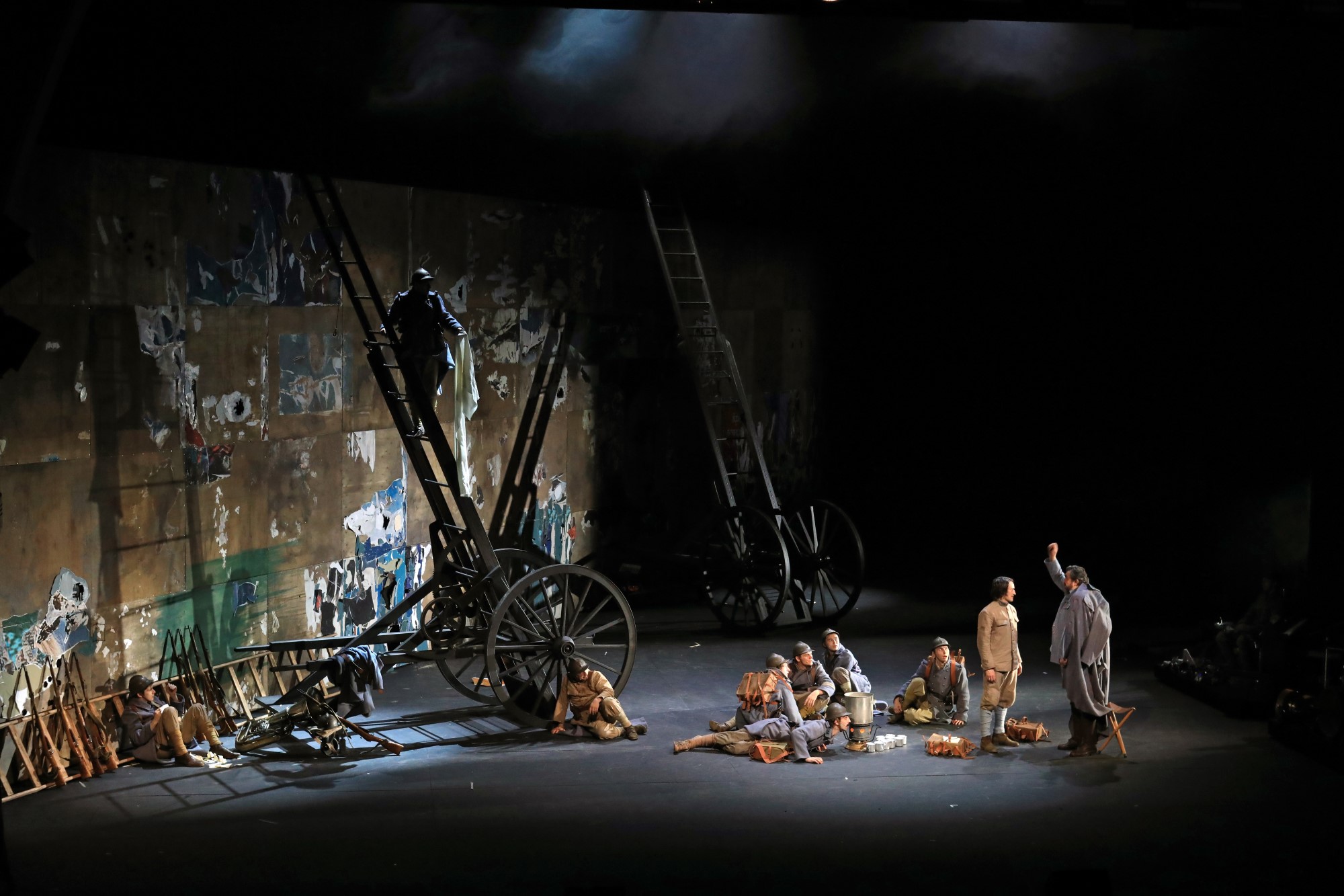 В спектакле происходят события XVII века, в пьесе, сочиненной в конце века XIX и поставленной на сцене МХТ им. Чехова в XXI веке. Сценографию организует диагональная стена, срезающая планшет сцены слева, дающая простор зрительской фантазии: стена ли это некоего вневременного "спального района", замусоленная объявлениями, сорванными афишами, вольными изображениями, или это некий лейтмотив "Берлинской стены", или преграда, граница, скрывающая от зрителя то, что ему не дано увидеть, но дано домыслить... В любом случае, подобный аскетизм художника неслучаен, он максимально "разгружает" сцену, дает простор динамичным мизансценам фехтующих и импровизациям музыкантов. Однако, когда это необходимо, сюда прикатывают "машину войны", или огромный золотой кутас - шторную кисть, или гигантское ядро... Все, происходящее на сцене, легко вписывается в живое, «дышащее», меняющееся пространство сцены.
