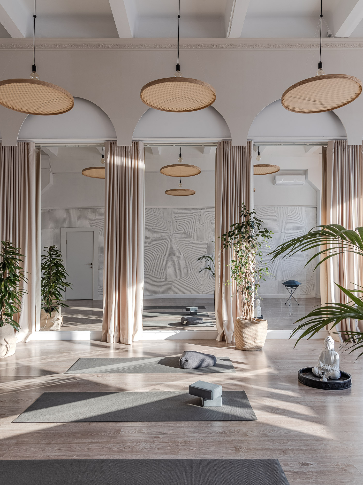 Заказчица мечтала о пространстве, где после городской суеты можно было бы раствориться в практике, выпить травяного чая в уютной гостиной и чувствовать себя будто в тропическом раю. Ответом стало решение поднять часть пространства на второй ярус — ведь потолки высотой 4,6 метра буквально кричали об этом. Так родился «воздушный остров»: внизу — раздевалки и душевые, залитые светом через стеклоблоки, а наверху — уютный уголок с кухней и диваном, где можно болтать с подругами после занятий. Металлические ажурные перила не только пропускают свет, но и выступают опорой для вьющихся растений — чтобы зелень мягко спускалась вниз, как в балийских джунглях. В гостиной — плетеные люстры, стеллажи с плавными линиями ручной работы и стена с загадочным орнаментом. Каждая деталь здесь дышит: встроенные полки для ковриков, открытые балки каркаса, оставленные «нарочно» грубоватые фактуры... Это место, где хочется замедлиться, прислушаться к себе — и, кажется, даже стены здесь начинают тихо напевать "оммм".