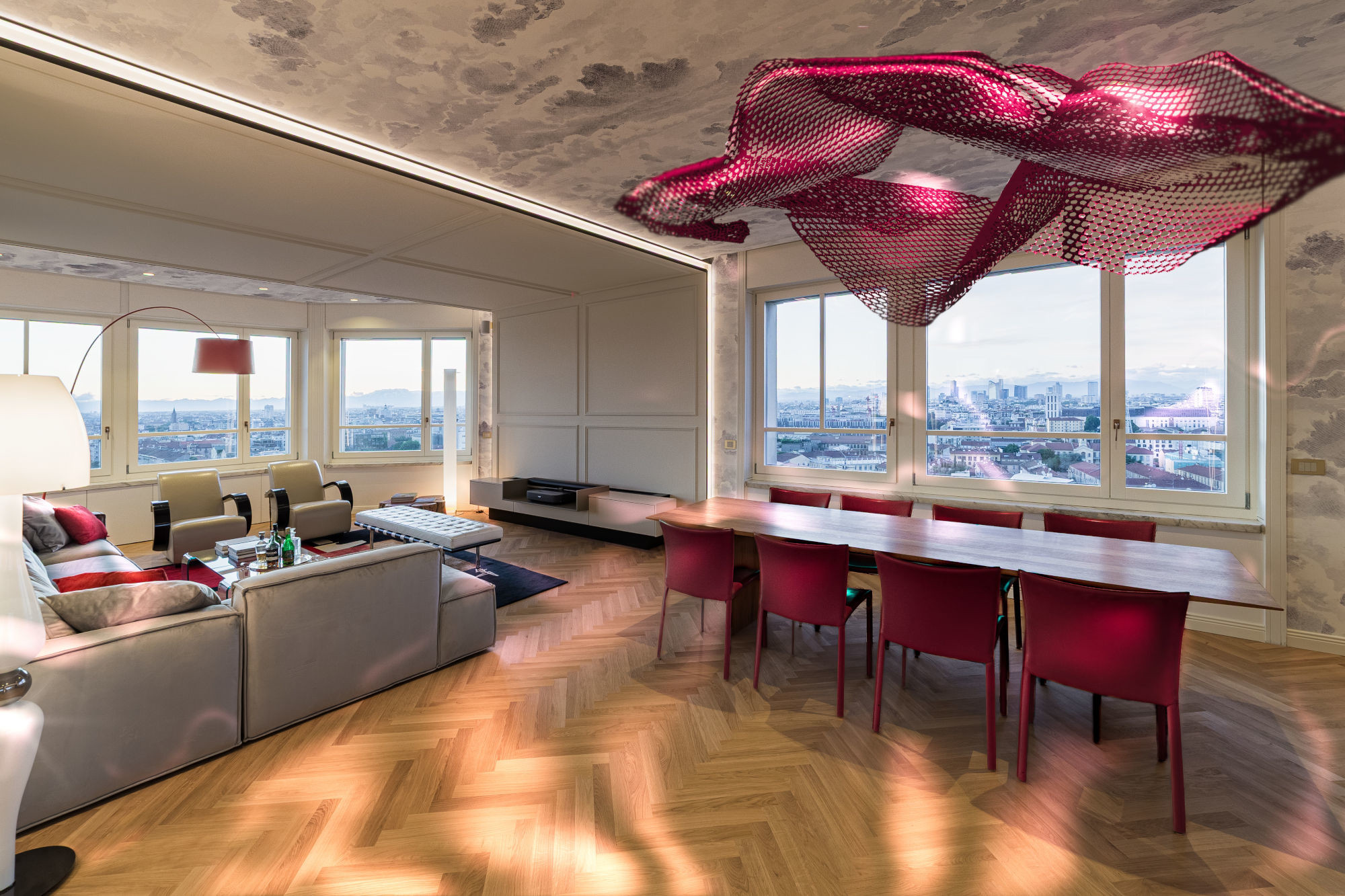 Описание проекта, предоставленное заявителем: Sky House — это жилище среди облаков, расположенное на шестнадцатом этаже, где граница между интерьером и улицей растворяется. Стены и потолок оформлены стилизованными обоями с облаками, создавая непрерывное небо, которое переносит городской горизонт внутрь дома. В этом парящем пространстве классические брусьевые боазерии действуют как настоящие парашюты классицизма: защитные элементы, которые фиксируют пространство и возвращают человеческий масштаб высокоэтажной жизни. Результат — уникальное равновесие, где воздушная легкость неба гармонично сочетается с убедительной прочностью архитектурной традиции.