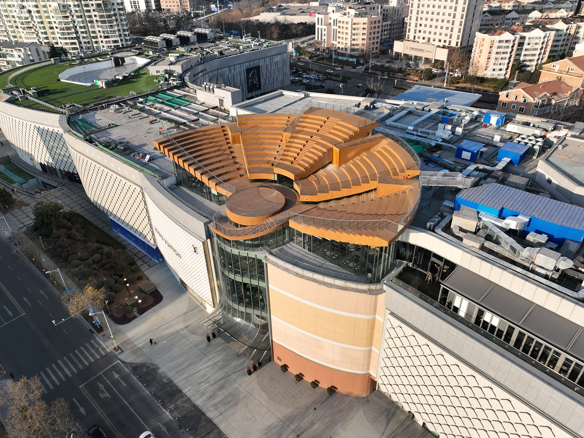 О проекте: Skybowl — это 5-этажная полукруглая пристройка с амфитеатром на крыше к существующему торговому центру, расположенная на высоте 35 м, над цокольным этажом. Амфитеатр состоит из 5 независимых секторов, поддерживаемых 12 изящными колоннами. Наполненный светом и оформленный золотыми панелями Skybowlсимволизирует солнце, отсюда и название проекта, которое можно перевести как «Небесная чаша».