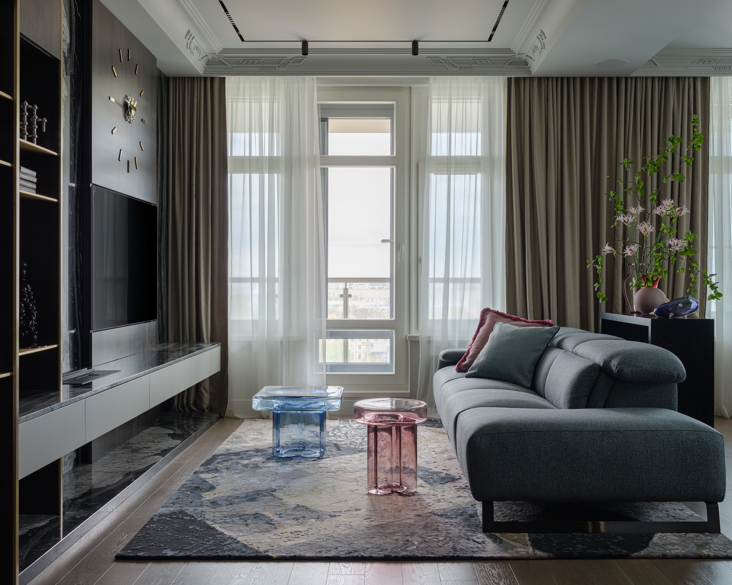 На судьбу проекта повлияла встреча в галерее Anna Nova, где хозяйка влюбилась в экспрессивную работу Анны Андржиевской «В плену любви». Картина настолько яркая, что могла бы поглотить интерьер, но стала его главным акцентом.