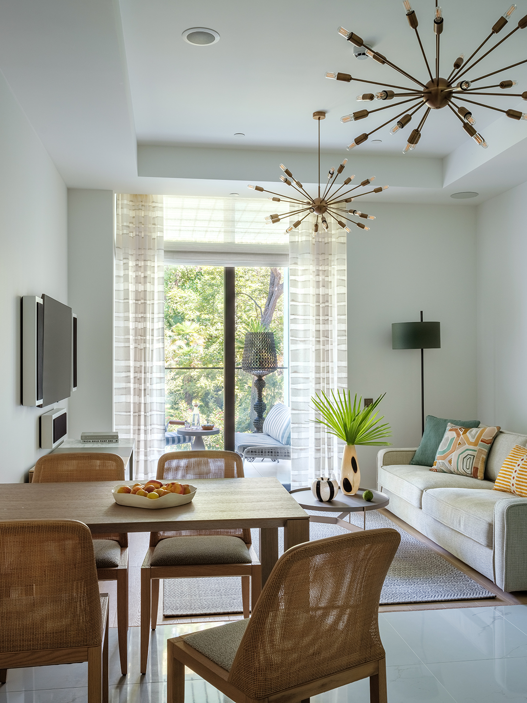 Современный интерьер с элементами средиземноморского стиля разработан для двухкомнатных апартаментов в премиальном жилом комплексе в Сочи. Квартира имела свободную планировку, поэтому интерьер разрабатывался с нуля, начиная с «нарезки» помещений. Важной частью проекта стало интегрирование инженерных решений (вентиляция, умный дом и т.п.) в дизайн апартаментов. Работа над интерьером включала полную комплектацию, вплоть до завершающих деталей, таких как предметы искусства, посуда, сшитое на заказ белье.