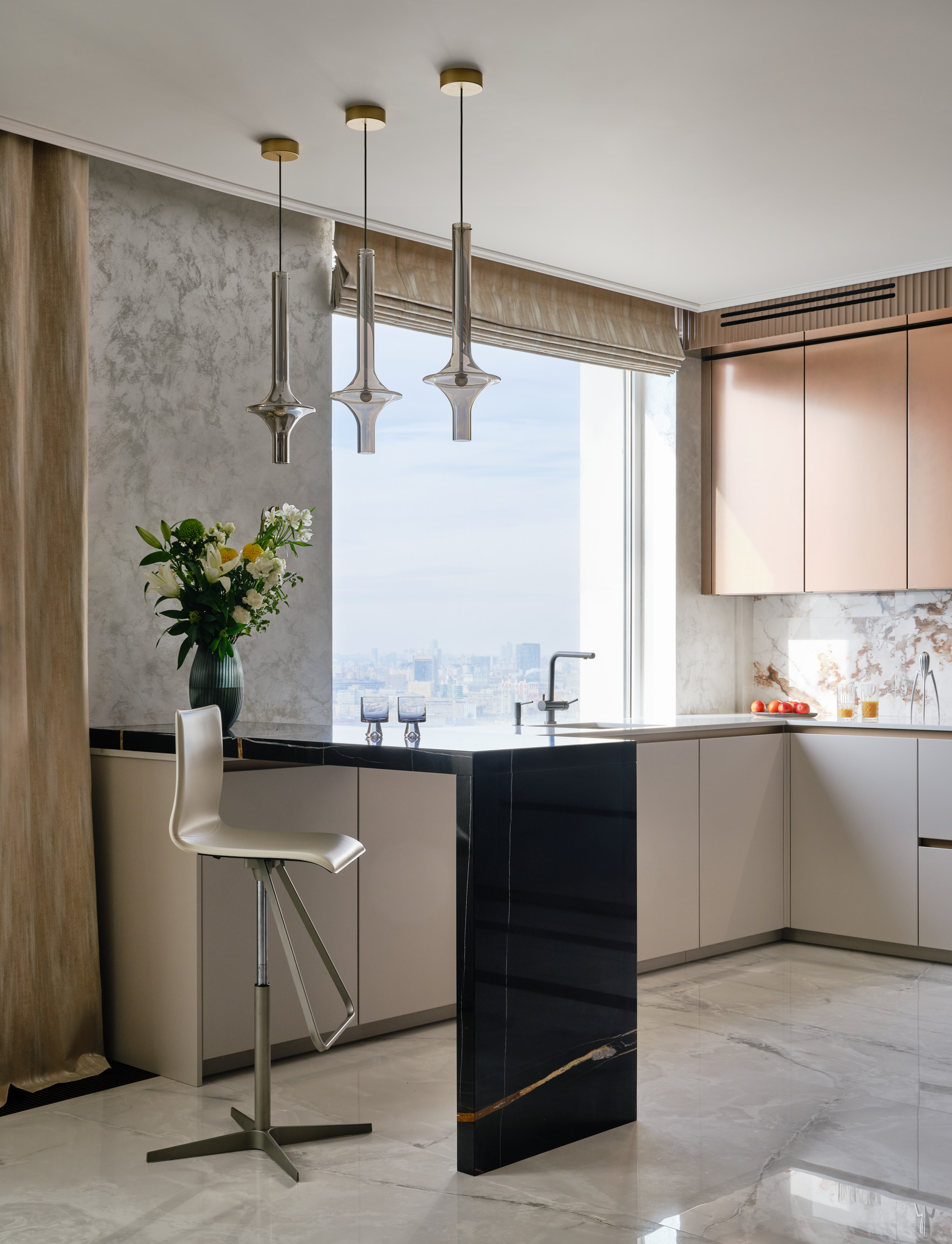 Первоначально квартира состояла из 3 небольших купленных рядом квартир, каждая со своей мокрой зоной и большим количеством несущих колонн. Клиент хотел сложный дизайн, с большим количеством зеркал, сочетанием разных материалов, таких как шпон, камень, латунь. Важно было учесть пожелания каждого члена семьи (4 человека на тот момент). В ходе ремонта игровую комнату пришлось переделывать в детскую для еще одного будущего ребенка.