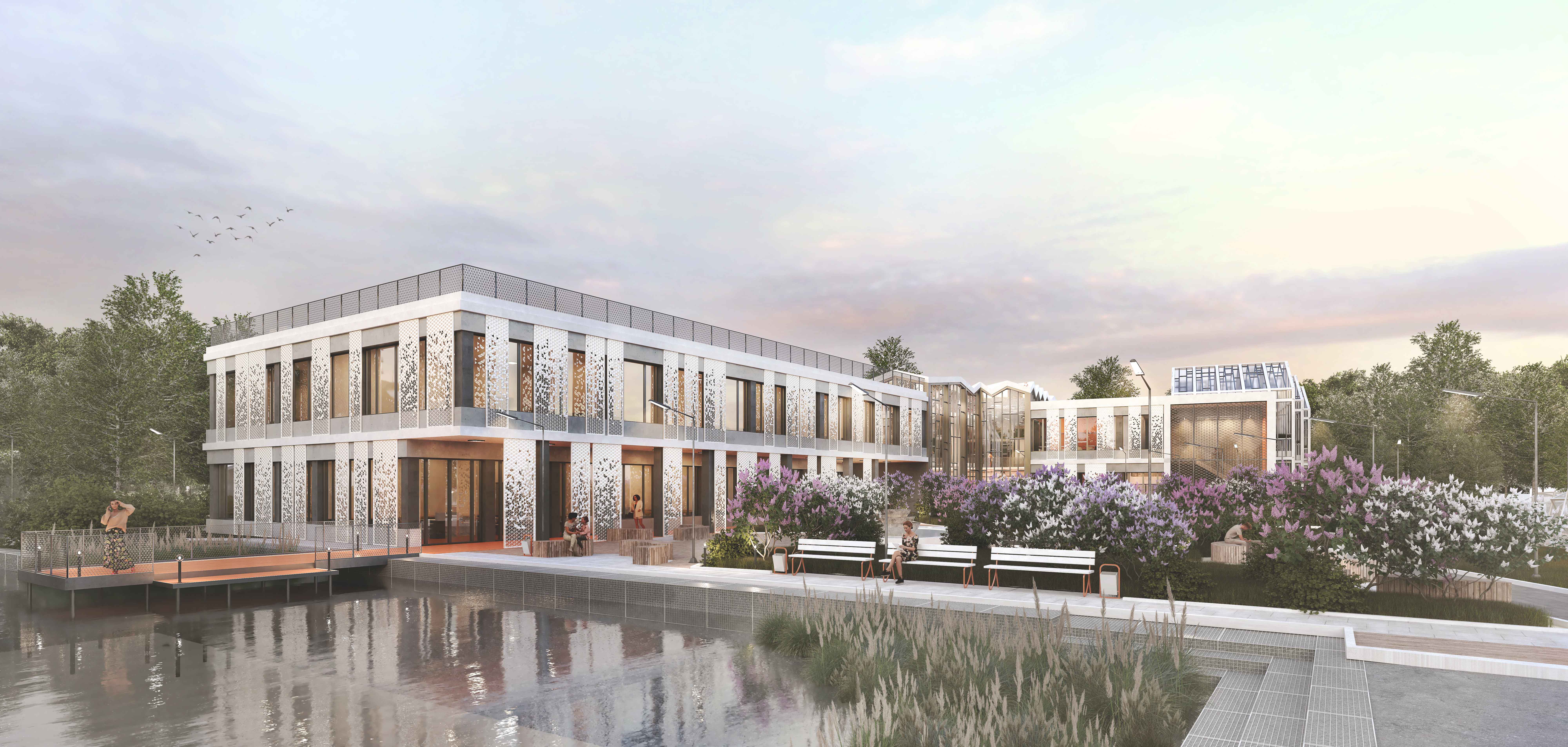 Ландшафтный корпус состоит из двух лаконичных объемов, соединенных круглым зданием амфитеатра. Амфитеатр играет важную роль - это главный зал всего кампуса, поэтому он решен в виде параметрической кровли. Важную роль в фасаде здания играют белые перфорированные панели - они вкупе с существующими деревьями задают вертикальный ритм, что создает большее разнообразие в горизонтальной части здания.
