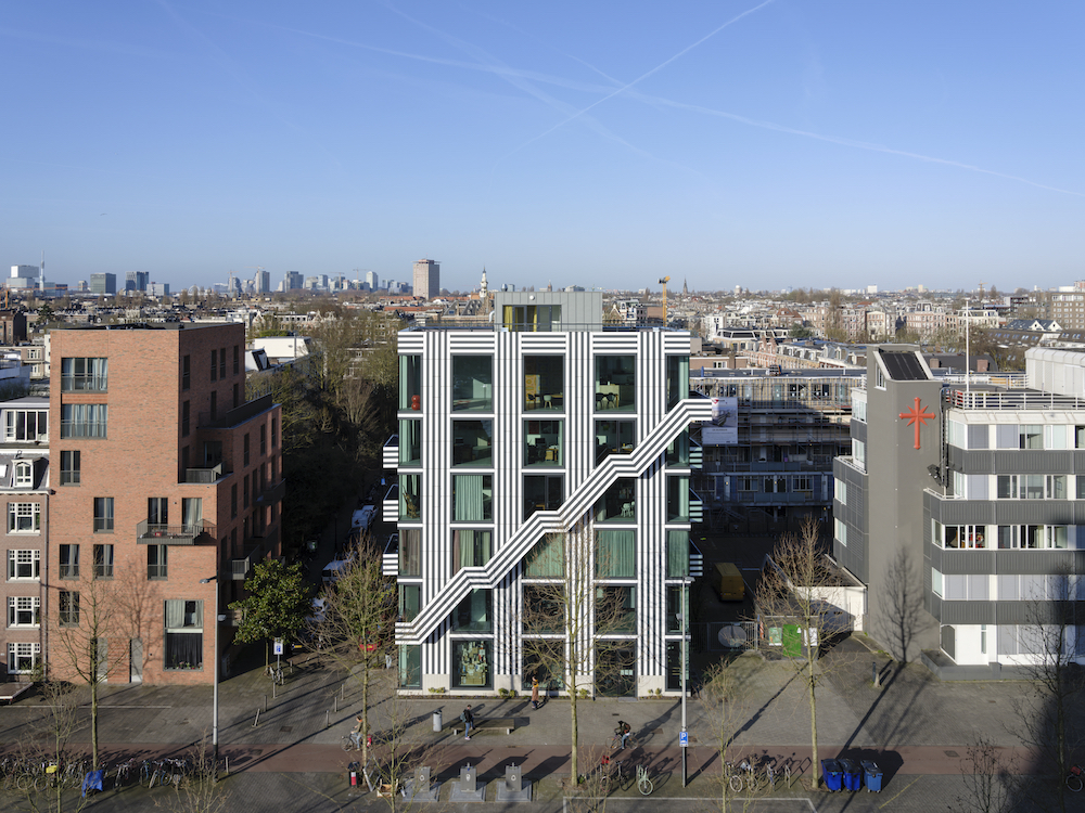 О проекте: Городская администрация с радостью разрешила творческой группе Thonik построить свою мастерскую на последнем свободном от застройки участке на перекрестке улиц Вибатстраат и Гренстраат. Вместе с MMX-architecten группа Thonik разработала и реализовала проект яркого графичного здания с фасадом в черно-белую полоску. Окна и фасадные панели сменяют друг друга через равные промежутки по вертикали и горизонтали, образуя узор, перечеркнутый по диагонали открытой лестницей.