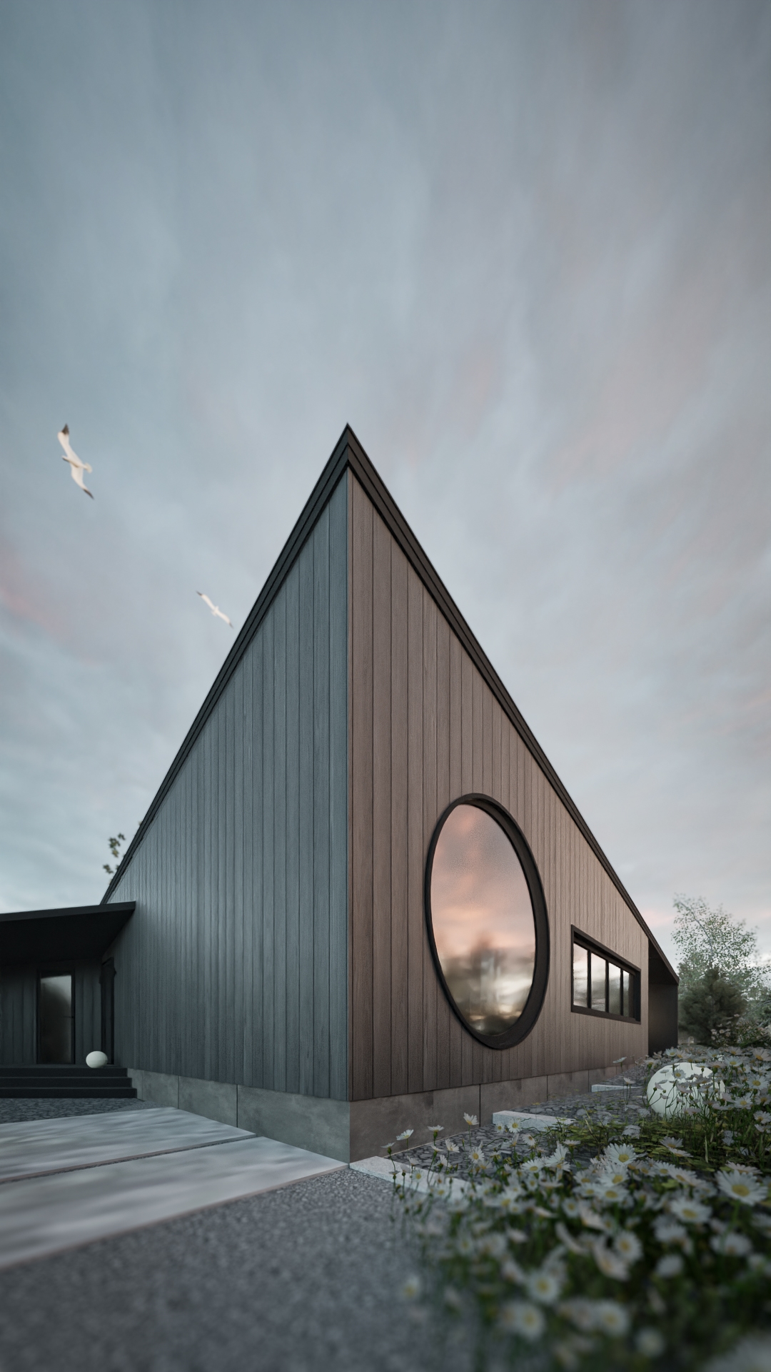 «Дом Солнца» - это гостевой дом с баней. Его архитектурный объем совмещает пространство внутри и снаружи. Под навесом на улице имеются различные локации для отдыха.