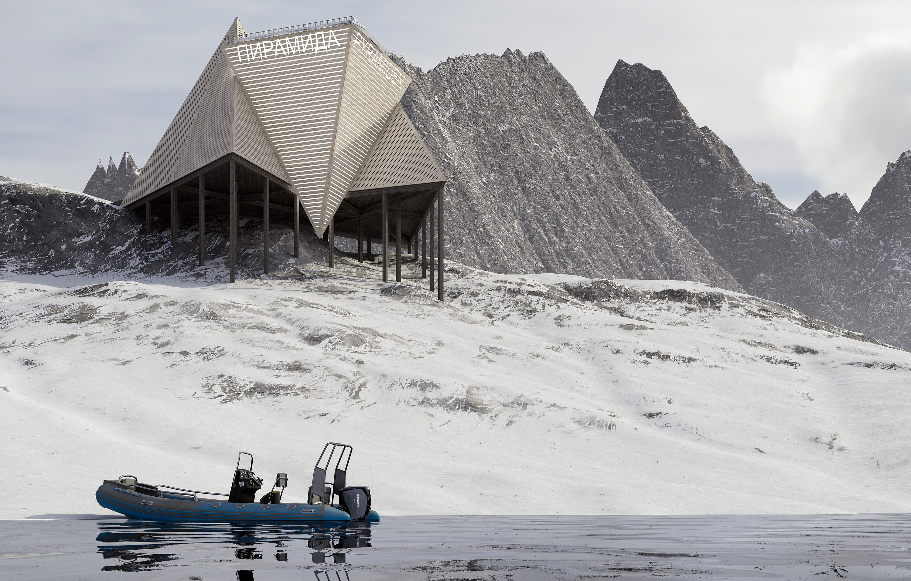 Описание проекта, предоставленное заявителем: Туристический визит-центр в посёлке Пирамида представляет собой композицию из нескольких пересекающихся пирамидальных объемов. Фасад здания облицован обработанной мореной лиственницей — дань традициям северного зодчества. Внутри посетителей встречают просторные интерьеры, решенные в эстетике сфумато, создав мягкое, рассеянное освещение, имитирующее уникальный свет Арктики. На первом и втором этажах расположены мультимедийная экспозиция, посвященная природе и уникальному статусу Шпицбергена, пространства для временных экспозиций и научных мероприятий. Кульминацией проекта становится подъём на эксплуатируемую кровлю, где обустроена панорамная смотровая площадка. Она предлагает захватывающий вид на законсервированный шахтерский поселок Пирамида, живописную бухту Петунья, величественный ледник Норденшельда и бескрайние арктические ландшафты. Фундамент на сваях бережёт вечную мерзлоту, гибридный каркас из дерева и стали противостоит стихиям, а трёхслойные стены надёжно хранят тепло.