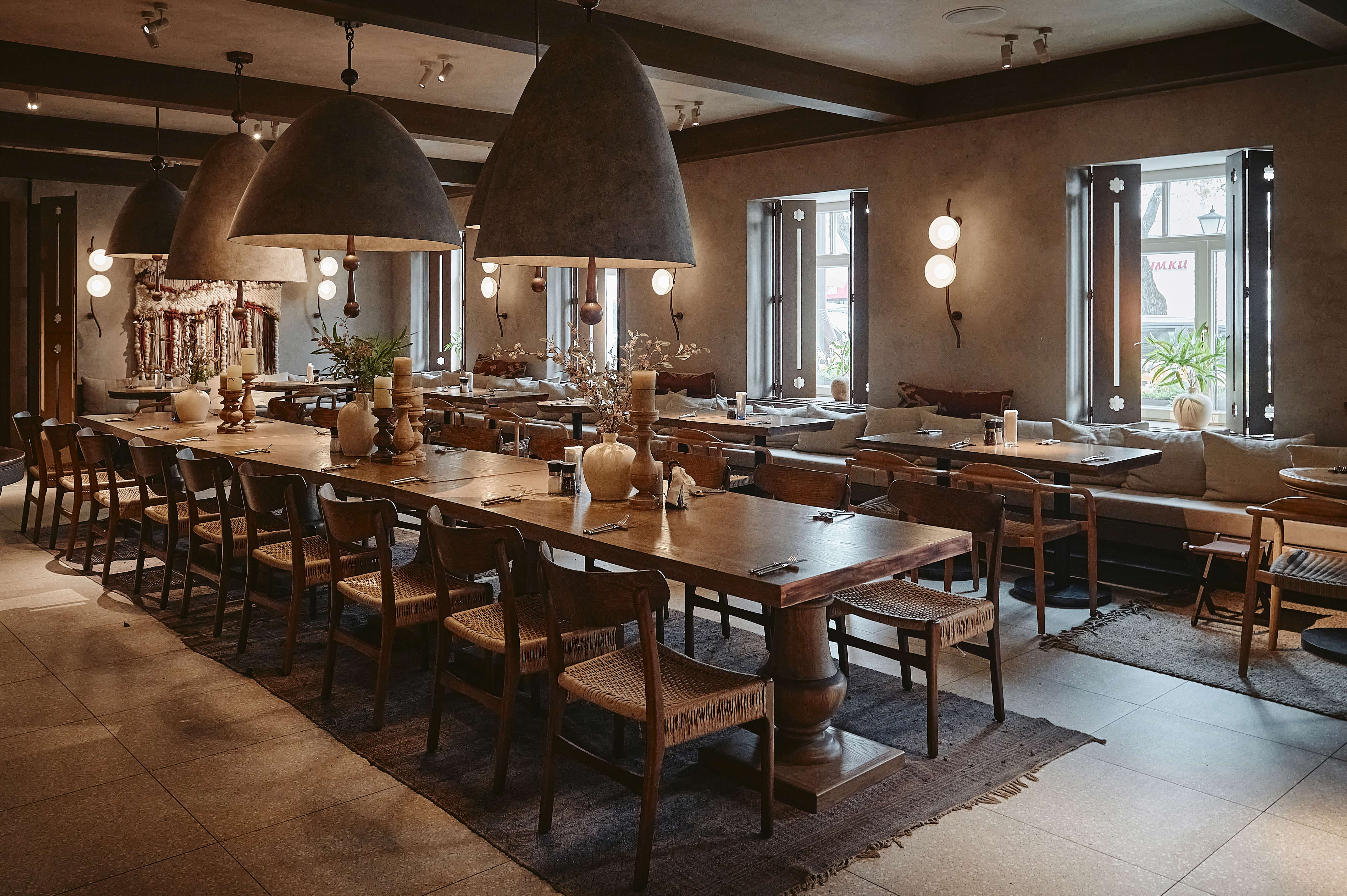 Интерьер ресторана выполнен в неорусском стиле. Декоративные колокола, резные ставни, ковры, восстановленные витражи XIX века и образ Жар-птицы формируют пространство, наполненное духом фольклора и русской культуры. Центральный зал с большим столом напоминает о древних застольях, а композиция из перьев Жар-птицы символически перекликается с настроением кухни, где блюда готовятся на открытом огне.